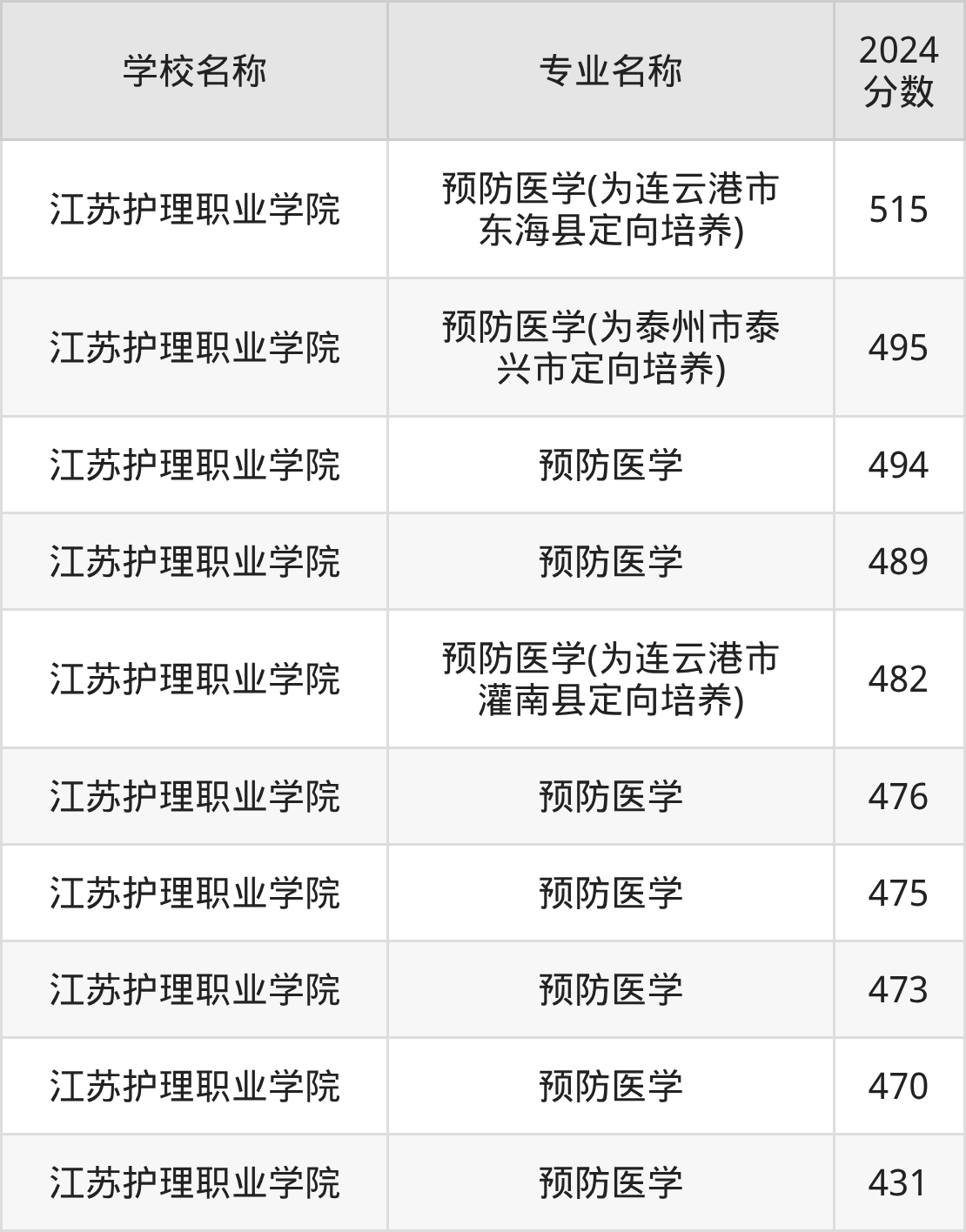 | 江苏护理职业学院 | 预防医学(为连 云港市赣榆区定 向培养) | 480 |