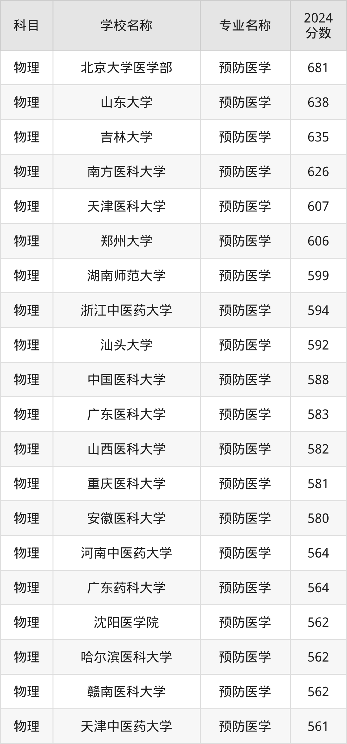 | 南京医科大学 | 预防医学(天元 创新班) | 639 |
