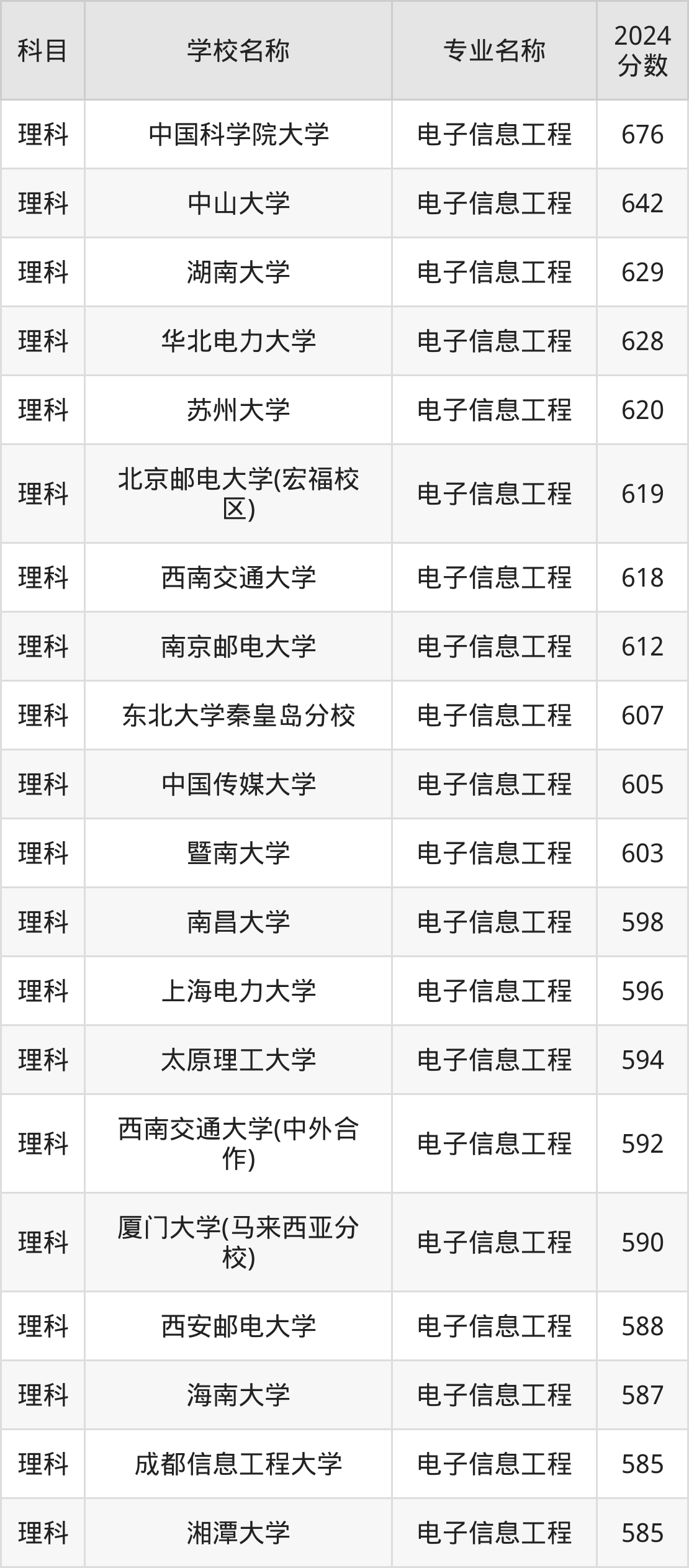 通过上文大家可以知晓,在云南省内招电子信息工程专业的院校数量较少,所以下文将为2025届高考生继续展示:省外大学的电子信息工程专业2024年在云南高考的录取情况,包含中国科学院大学、中山大学、湖南大学、华北电力大学、苏州大学。