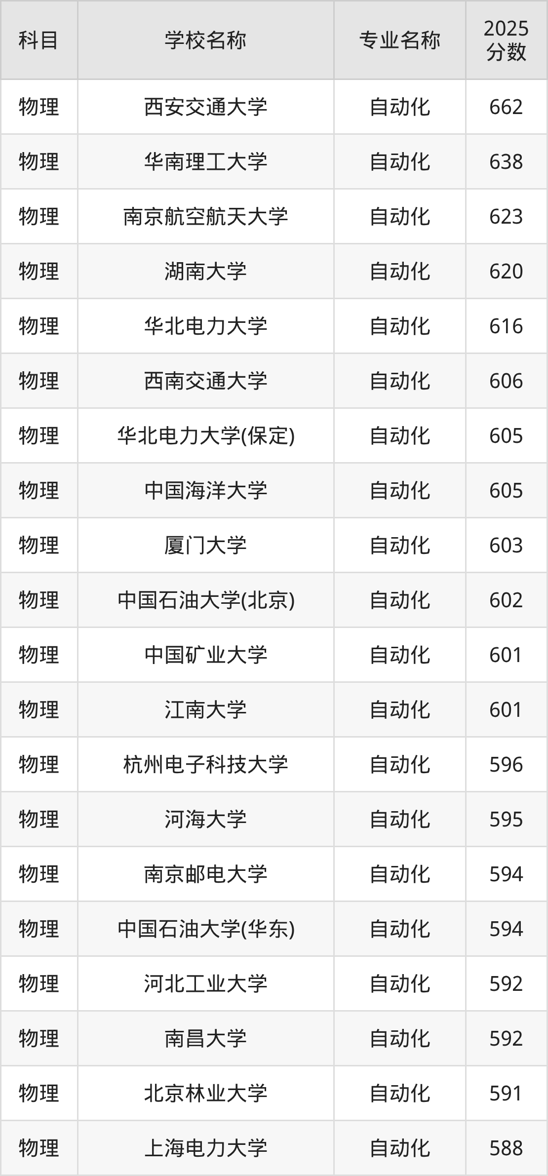 通过上文大家可以知晓,在吉林省内招自动化专业的院校数量较少,所以下文将为2026届高考生继续展示:省外大学的自动化专业2025年在吉林高考的录取情况,包含西安交通大学、华南理工大学、南京航空航天大学、湖南大学、华北电力大学。