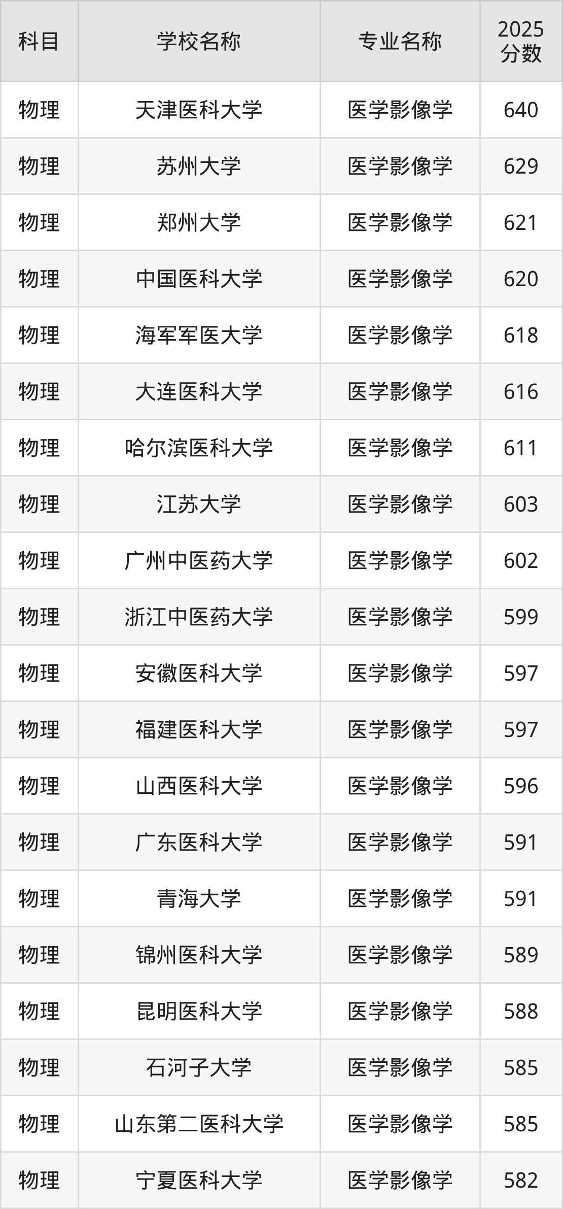 通过上文大家可以知晓,在河北省内招医学影像学专业的院校数量较少,所以下文将为2026届高考生继续展示:省外大学的医学影像学专业2025年在河北高考的录取情况,包含天津医科大学、苏州大学、郑州大学、中国医科大学、海军军医大学。