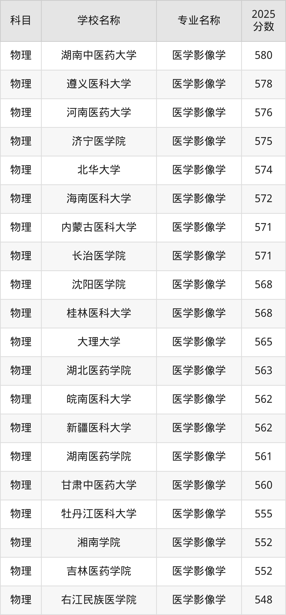 | 华北理工大学 | 医学影像学 | 574 |