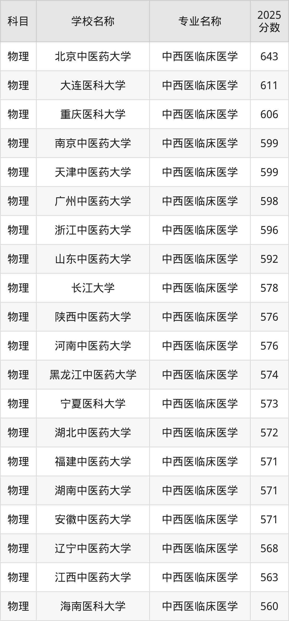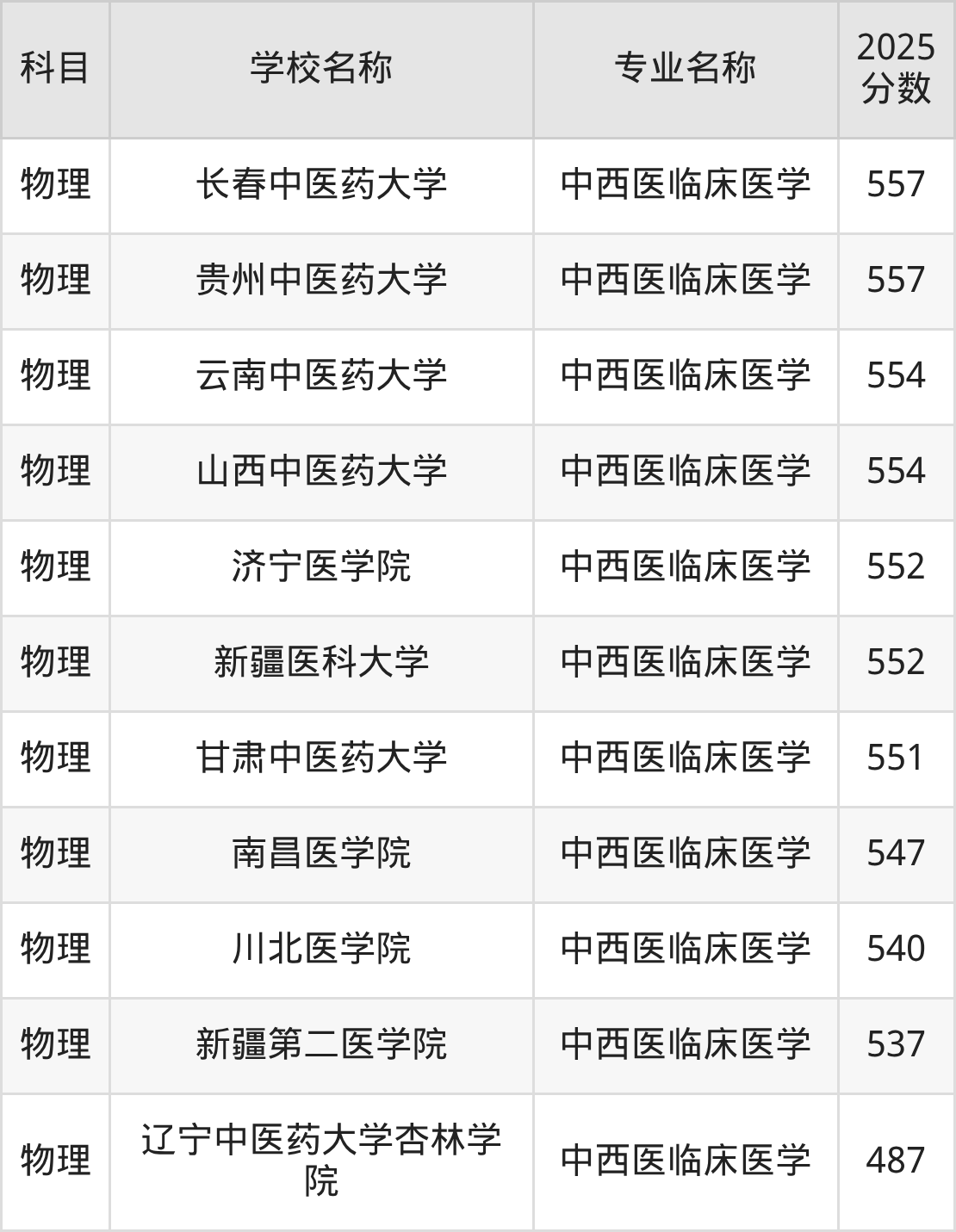 通过上文大家可以知晓,在河北省内招中西医临床医学专业的院校数量较少,所以下文将为2026届高考生继续展示:省外大学的中西医临床医学专业2025年在河北高考的录取情况,包含北京中医药大学、大连医科大学、重庆医科大学、南京中医药大学、天津中医药大学。