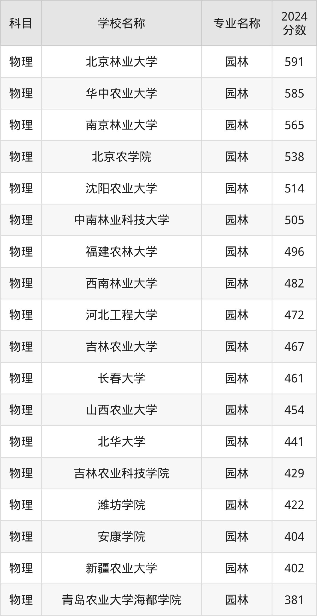 在直接以“园林”的名称招生的黑龙江省大学中,东北农业大学的分数线最高、排名第一名,在物理组的最低分是534分,全省排名前24261位的高考生才有较大机会被录取。