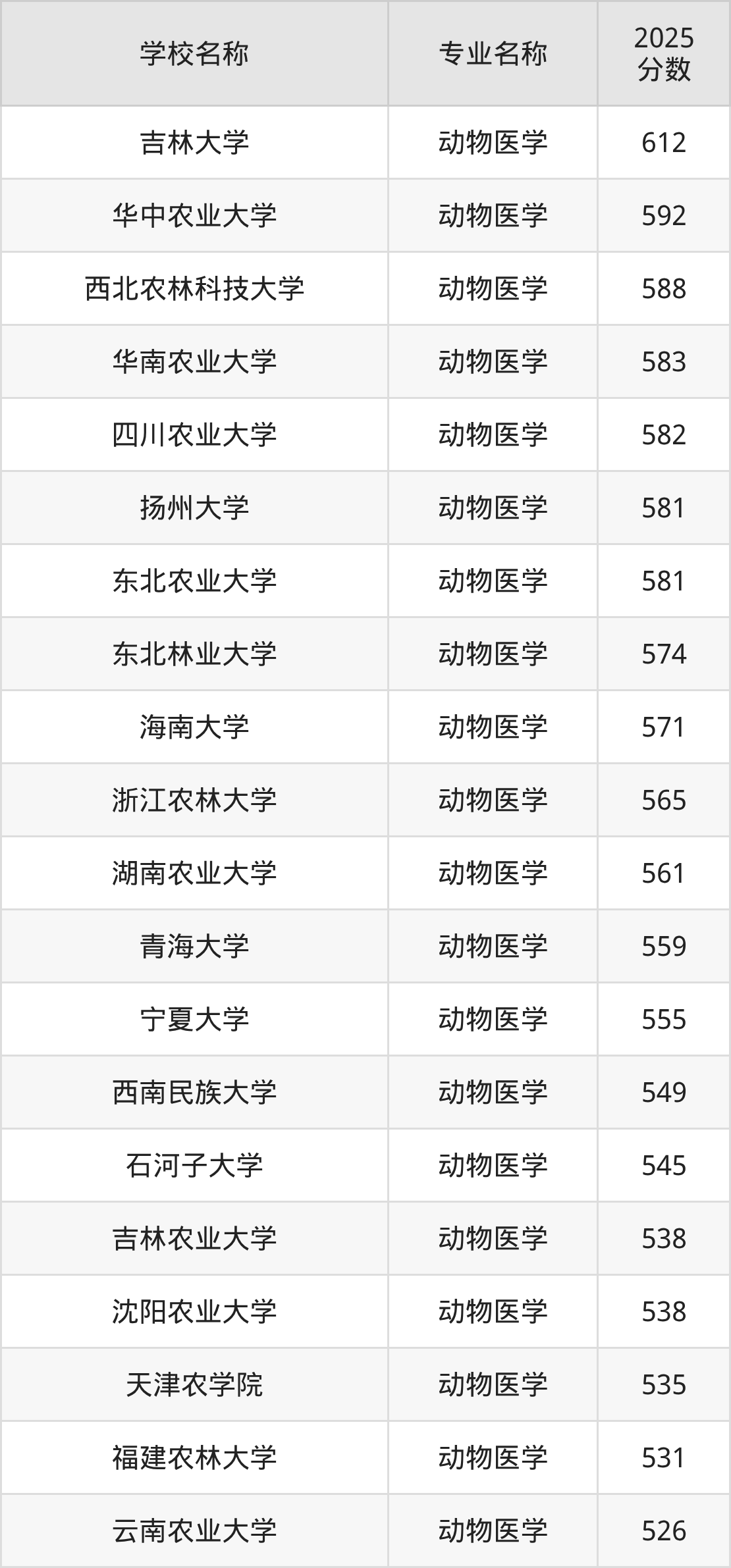 通过上文大家可以知晓,在山东省内招动物医学专业的院校数量较少,所以下文将为2026届高考生继续展示:省外大学的动物医学专业2025年在山东高考的录取情况,包含吉林大学、华中农业大学、西北农林科技大学、华南农业大学、四川农业大学。