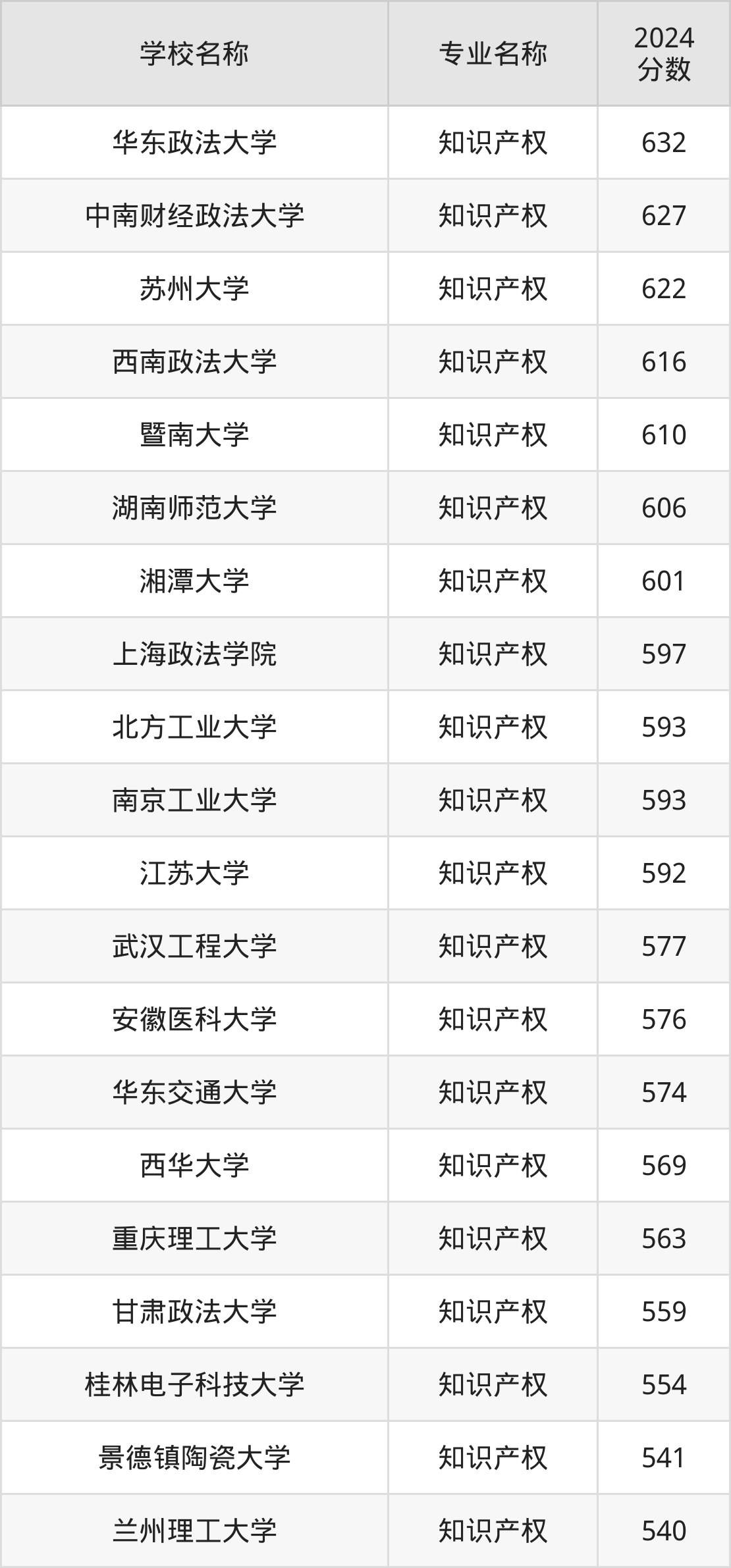 | 山东政法学院 | 知识产权 | 543 |