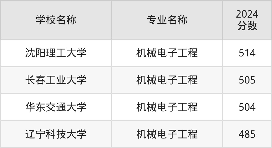 通过上文大家可以知晓,在北京市内招机械电子工程专业的院校数量较少,所以下文将为2026届高考生继续展示:市外大学的机械电子工程专业2024年在北京高考的录取情况,包含沈阳理工大学、长春工业大学、华东交通大学、辽宁科技大学。