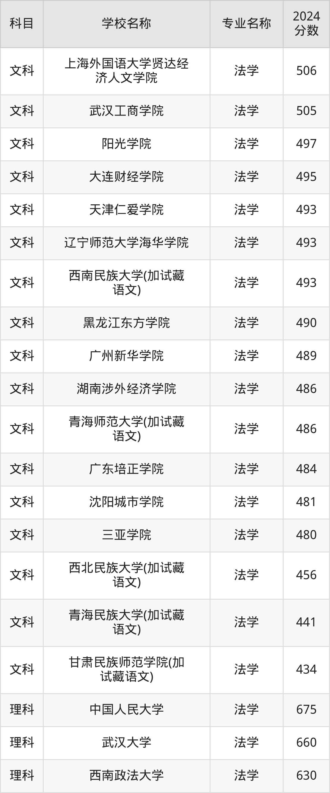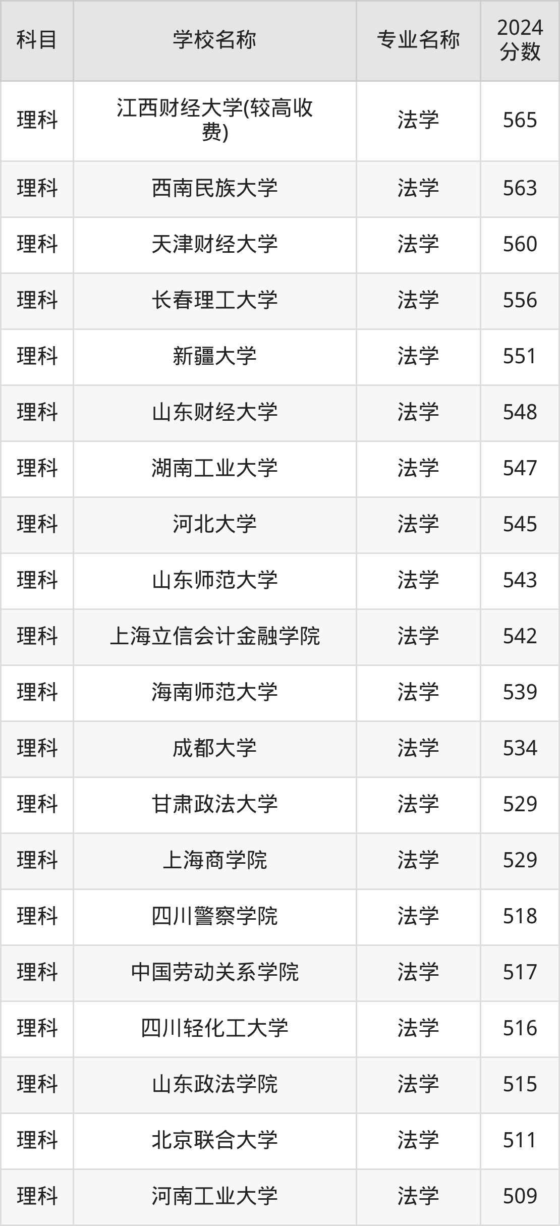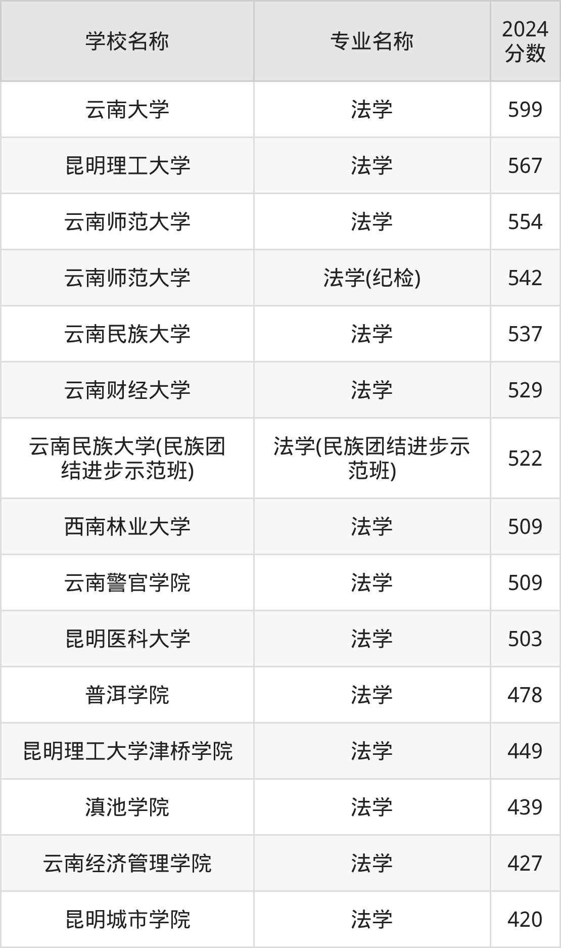 | 云南警官学院 | 法学 | 555 |
