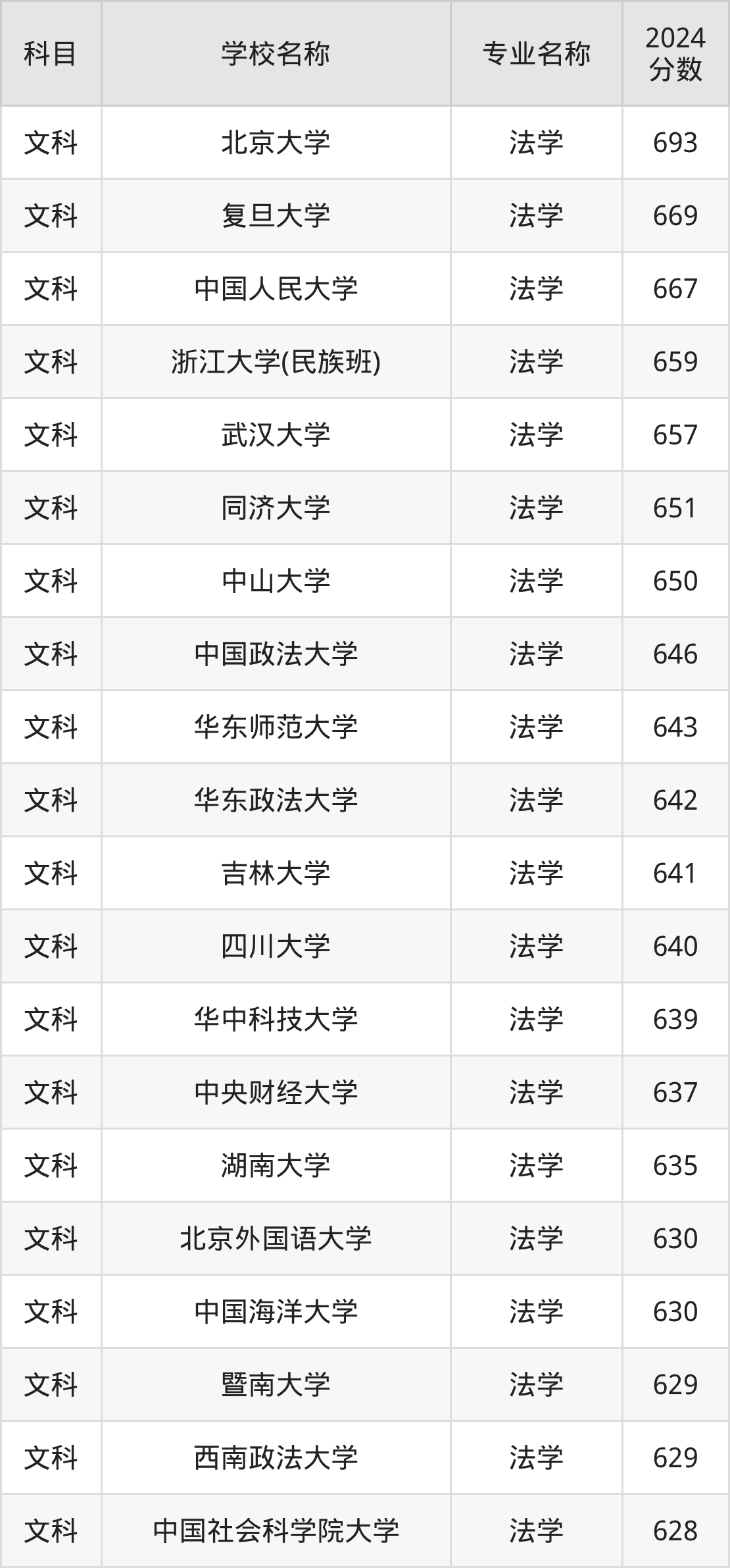 通过上文大家可以知晓,在云南省内招法学专业的院校数量较少,所以下文将为2026届高考生继续展示:省外大学的法学专业2024年在云南高考的录取情况,包含北京大学、复旦大学、中国人民大学、浙江大学(民族班)、武汉大学。