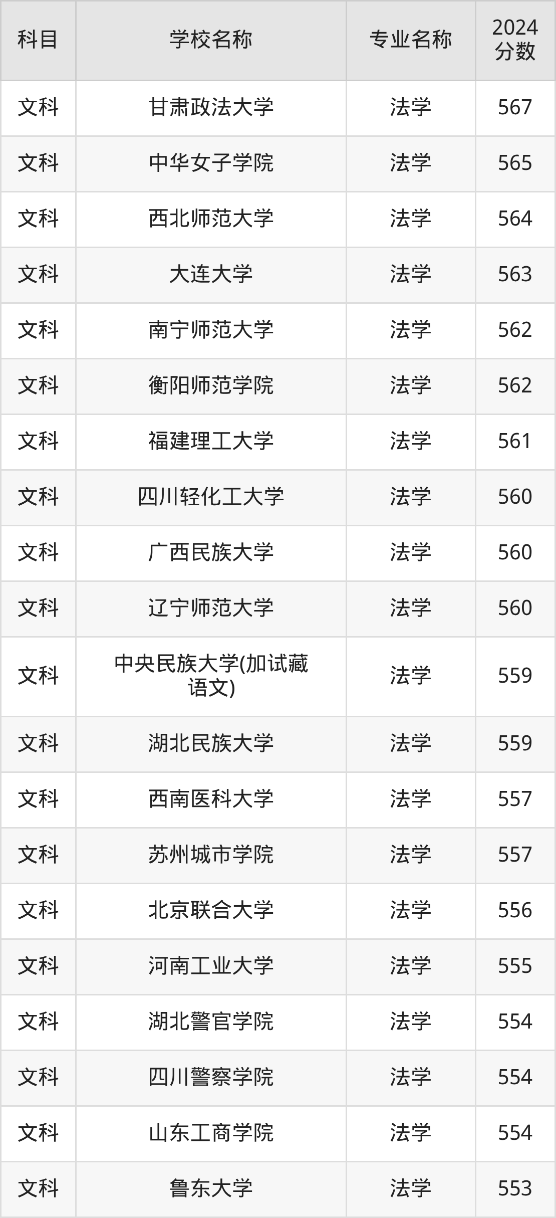 | 大理大学 | 法学 | 562 |