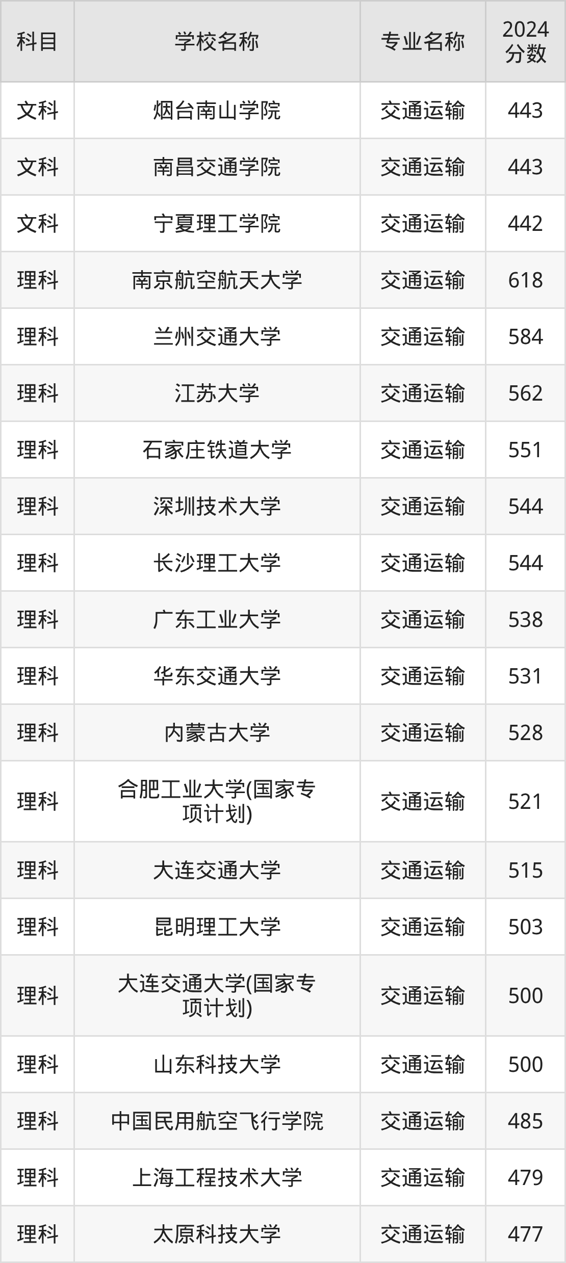 通过上文大家可以知晓,在陕西省内招交通运输专业的院校数量较少,所以下文将为2026届高考生继续展示:省外大学的交通运输专业2024年在陕西高考的录取情况,包含烟台南山学院、南昌交通学院、宁夏理工学院、南京航空航天大学、兰州交通大学。