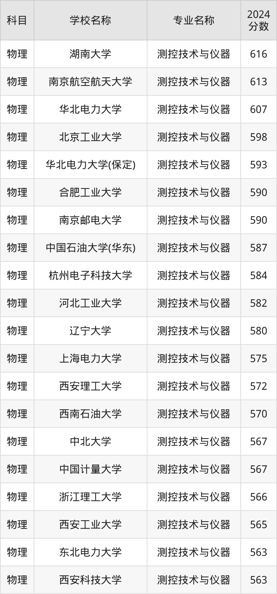 通过上文大家可以知晓,在甘肃省内招测控技术与仪器专业的院校数量较少,所以下文将为2026届高考生继续展示:省外大学的测控技术与仪器专业2024年在甘肃高考的录取情况,包含湖南大学、南京航空航天大学、华北电力大学、北京工业大学、华北电力大学(保定)。