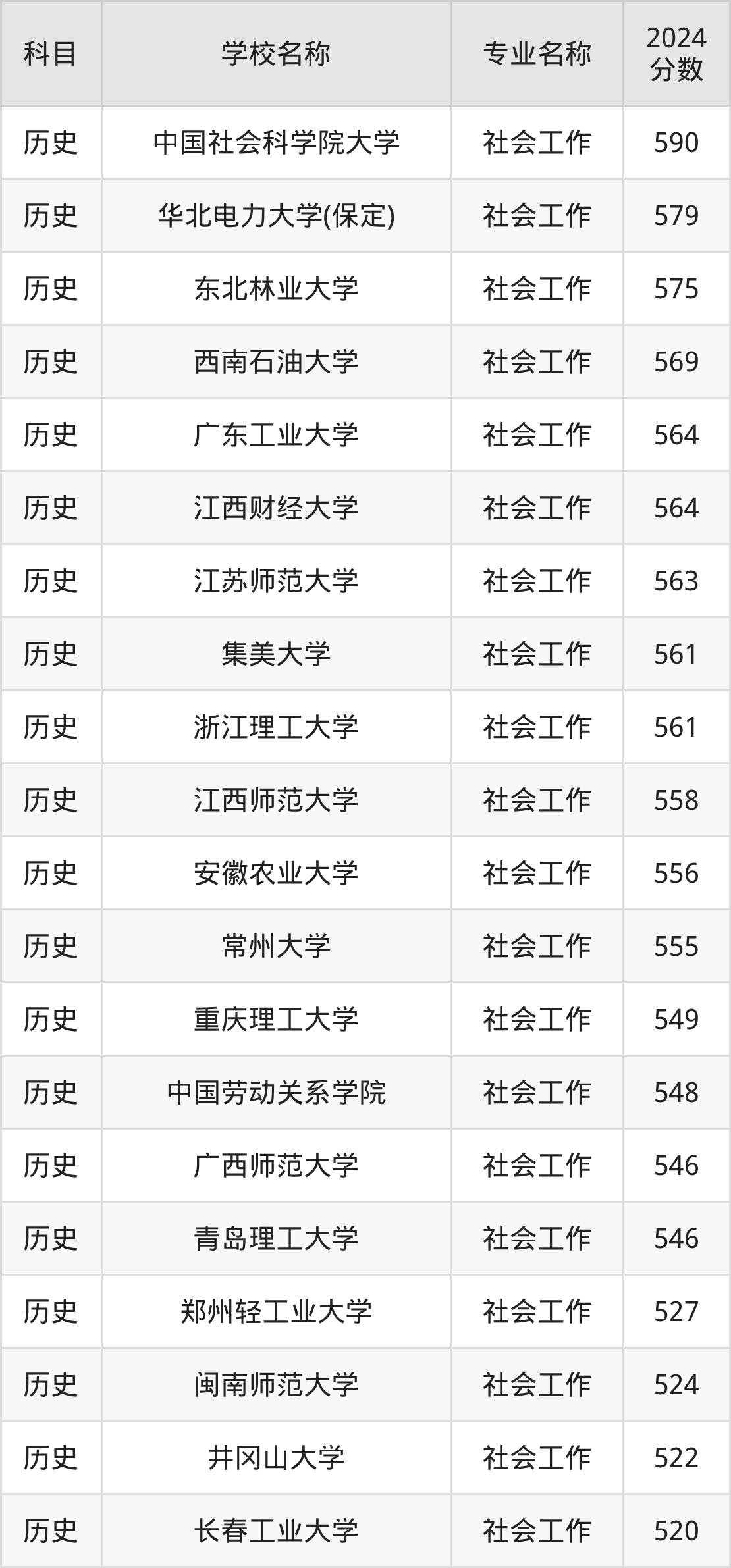 通过上文大家可以知晓,在湖北省内招社会工作专业的院校数量较少,所以下文将为2026届高考生继续展示:省外大学的社会工作专业2024年在湖北高考的录取情况,包含中国社会科学院大学、华北电力大学(保定)、东北林业大学、西南石油大学、广东工业大学。