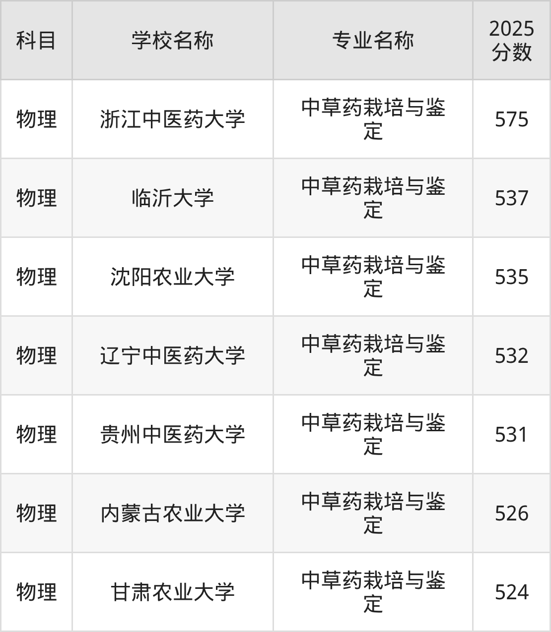 通过上文大家可以知晓,在河北省内招中草药栽培与鉴定专业的院校数量较少,所以下文将为2026届高考生继续展示:省外大学的中草药栽培与鉴定专业2025年在河北高考的录取情况,包含浙江中医药大学、临沂大学、沈阳农业大学、辽宁中医药大学、贵州中医药大学。