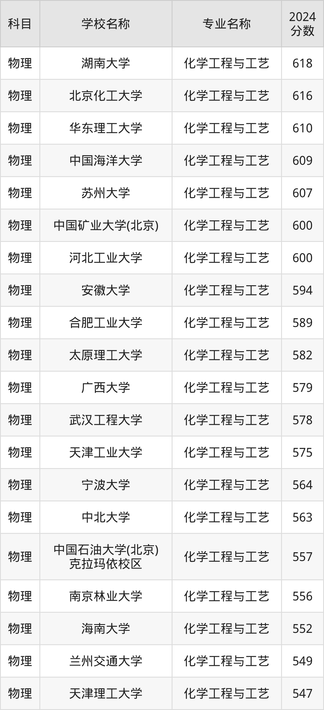 通过上文大家可以知晓,在黑龙江省内招化学工程与工艺专业的院校数量较少,所以下文将为2026届高考生继续展示:省外大学的化学工程与工艺专业2024年在黑龙江高考的录取情况,包含湖南大学、北京化工大学、华东理工大学、中国海洋大学、苏州大学。