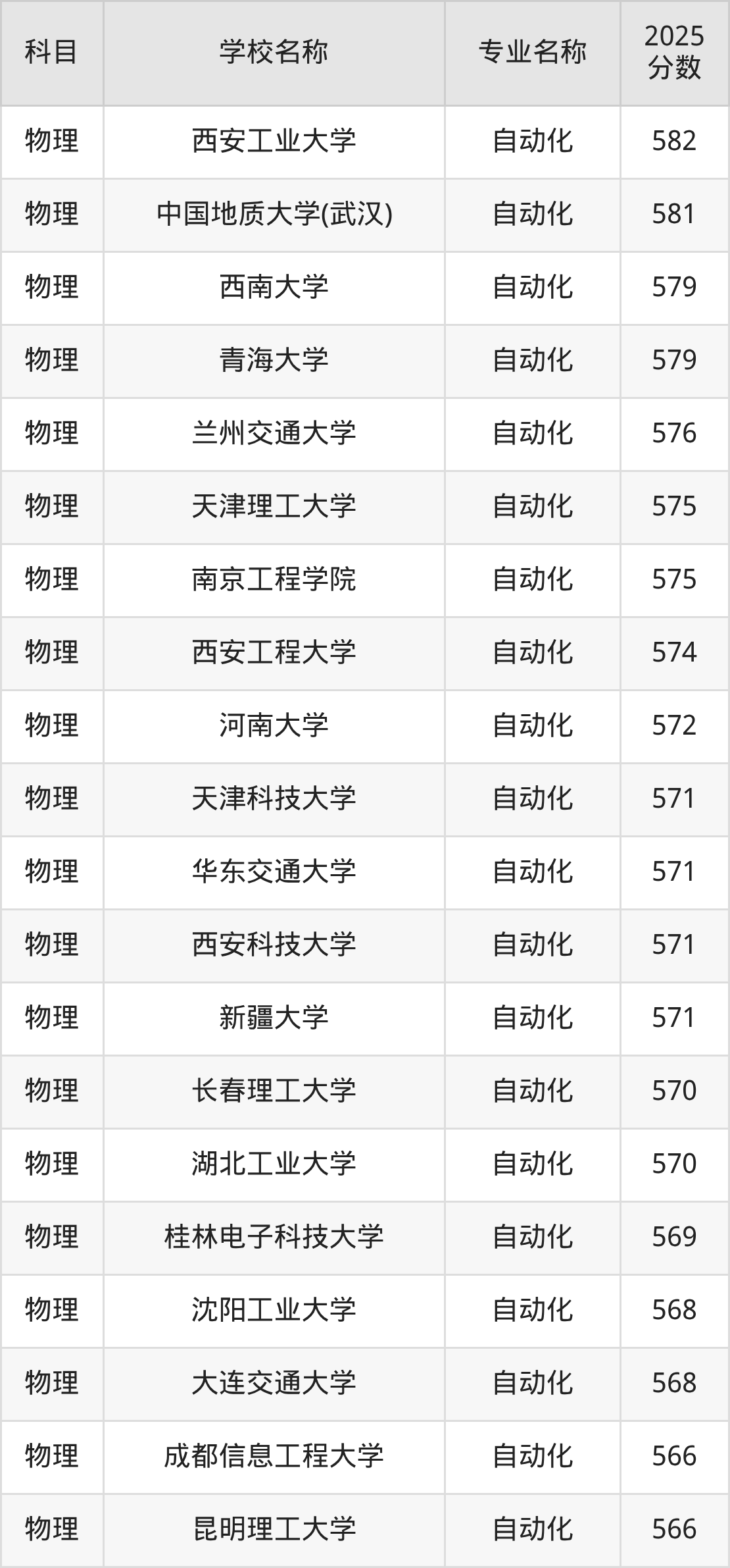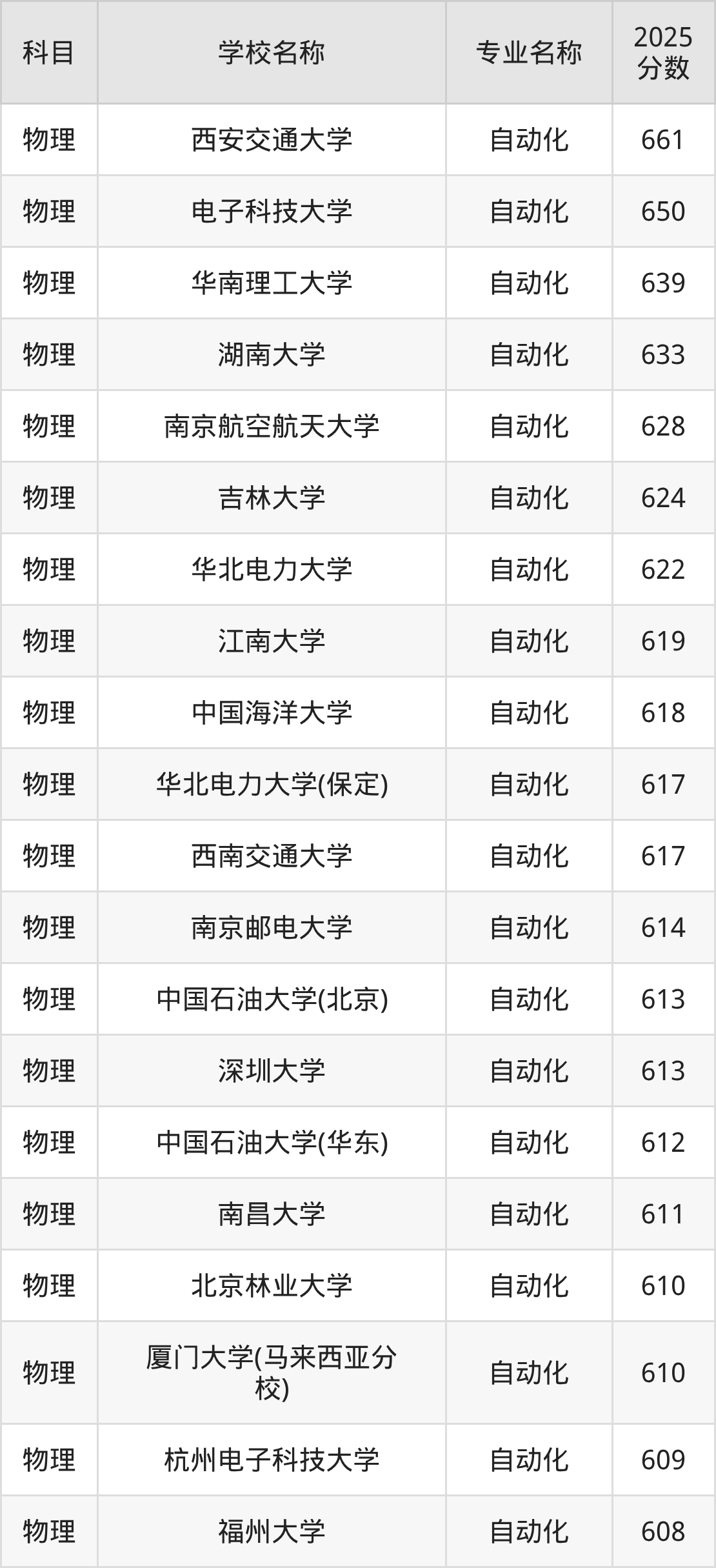 通过上文大家可以知晓,在山西省内招自动化专业的院校数量较少,所以下文将为2026届高考生继续展示:省外大学的自动化专业2025年在山西高考的录取情况,包含西安交通大学、电子科技大学、华南理工大学、湖南大学、南京航空航天大学。