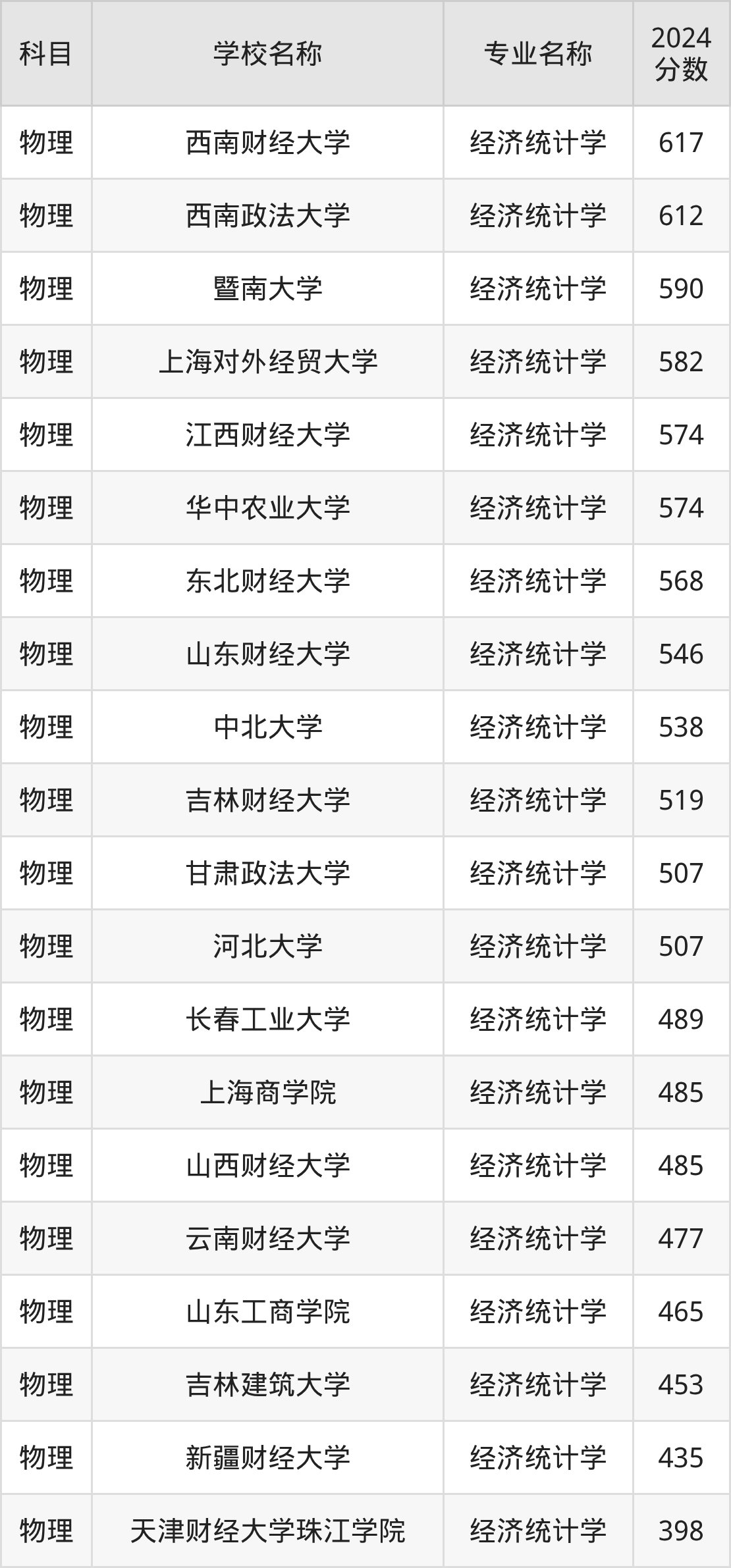 通过上文大家可以知晓,在黑龙江省内招经济统计学专业的院校数量较少,所以下文将为2026届高考生继续展示:省外大学的经济统计学专业2024年在黑龙江高考的录取情况,包含西南财经大学、西南政法大学、暨南大学、上海对外经贸大学、江西财经大学。