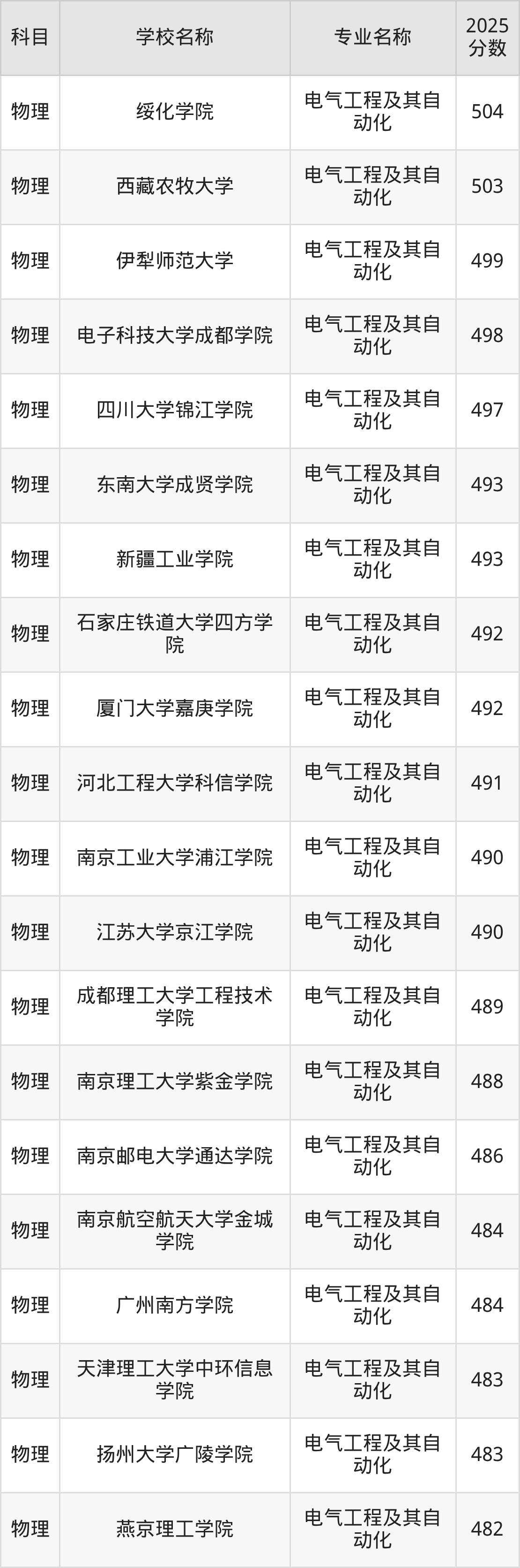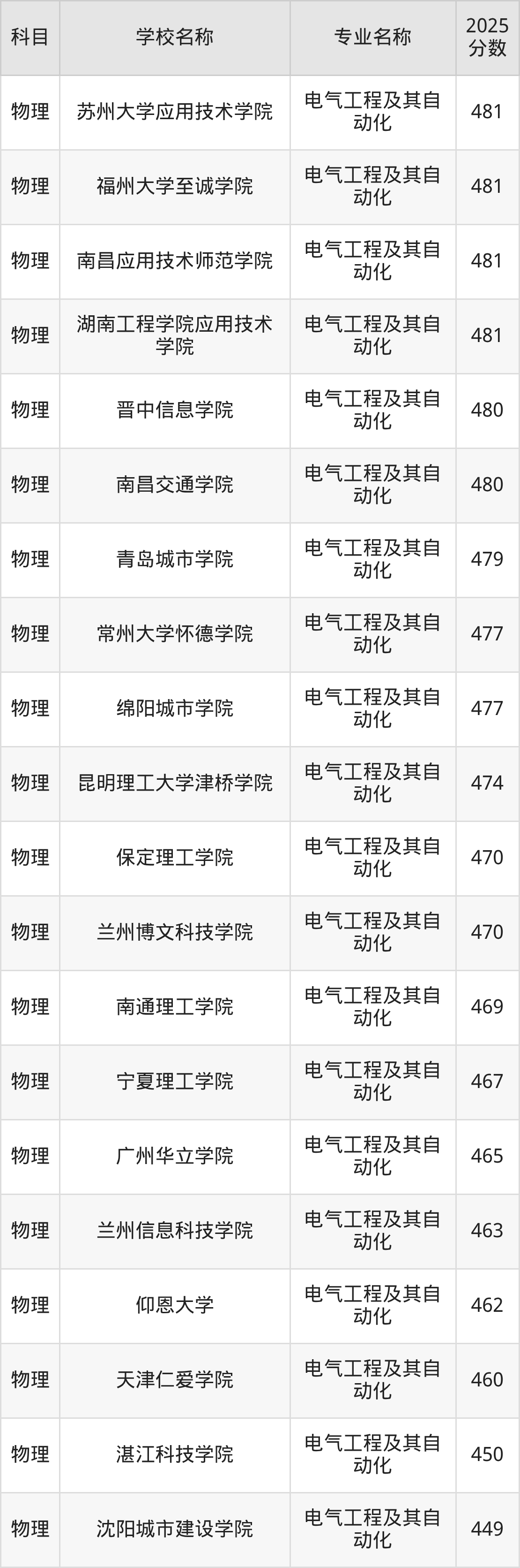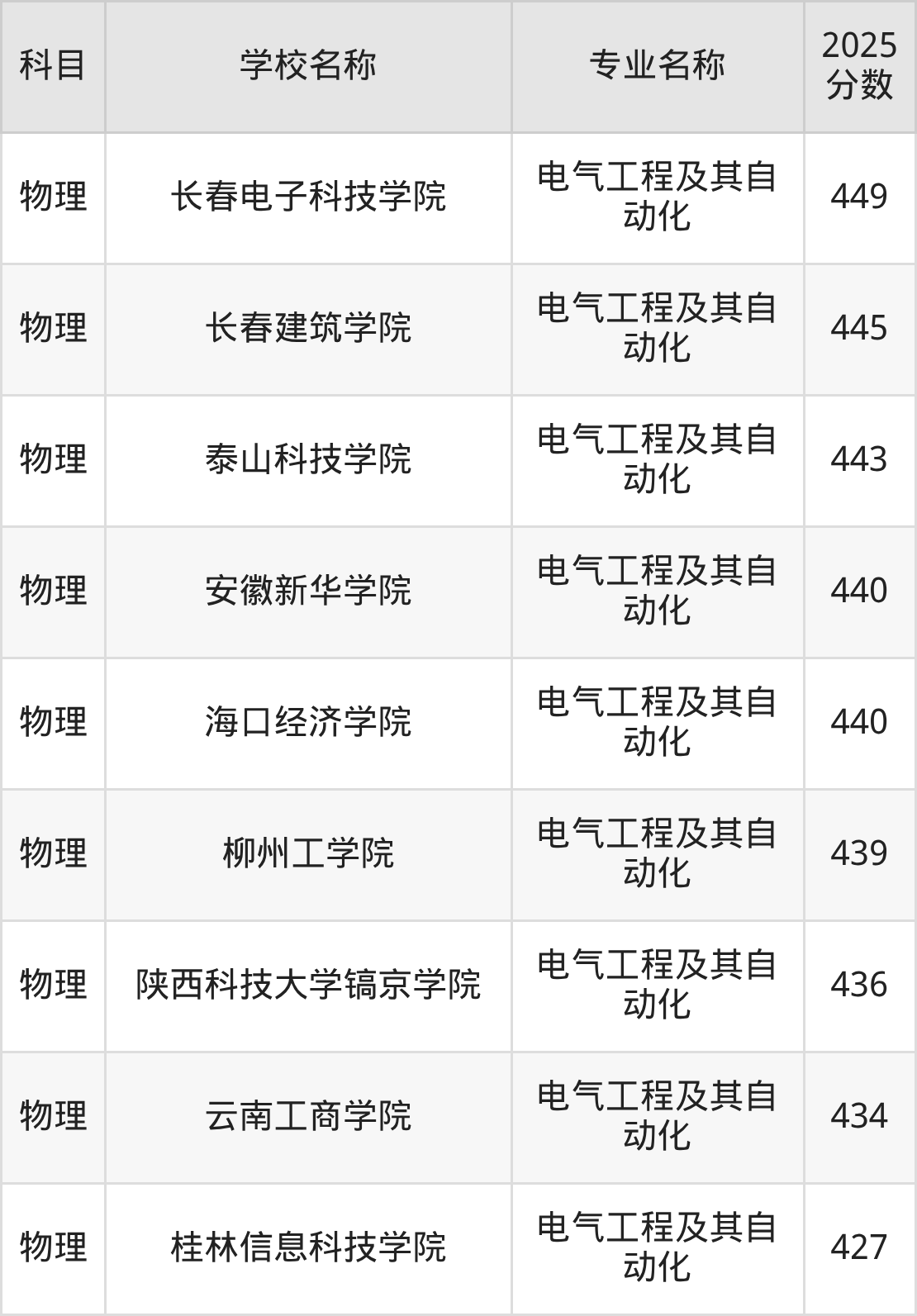 | 重庆城市科技学院 | 电气工程及其自 动化 | 425 |