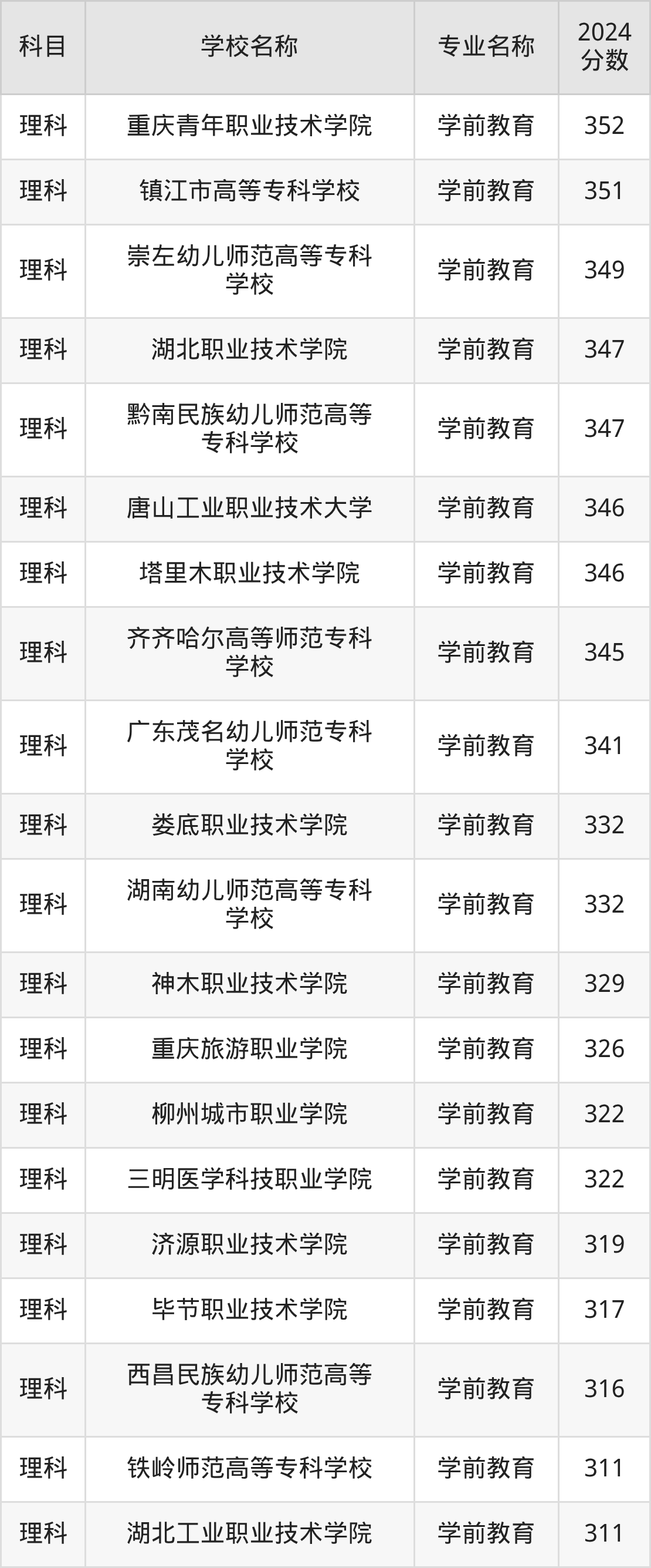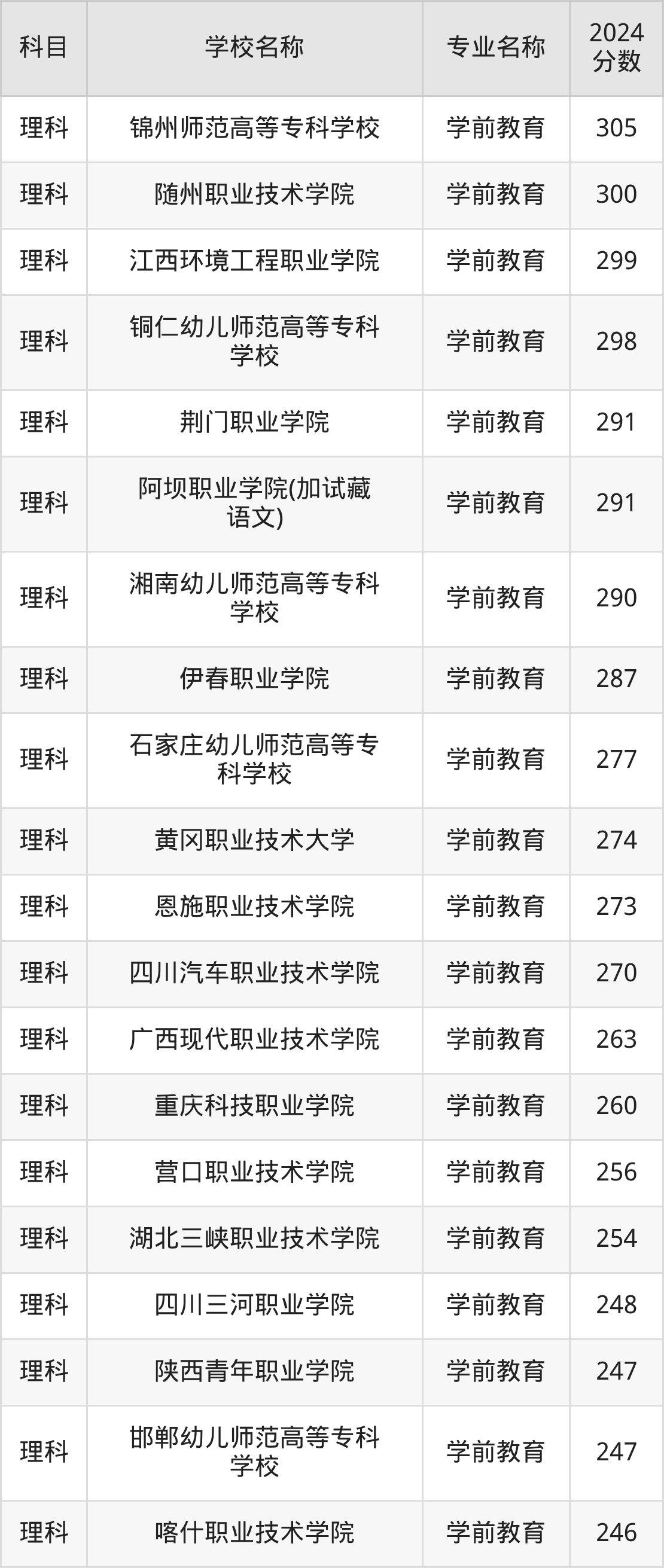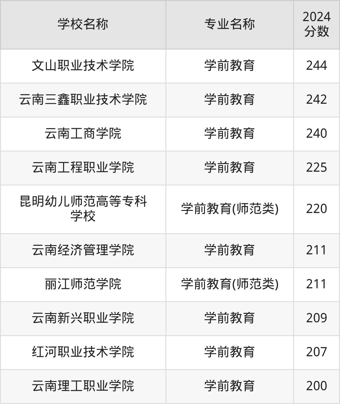 | 昆明幼儿师范高等专科 学校 | 学前教育(师范 类) | 301 |