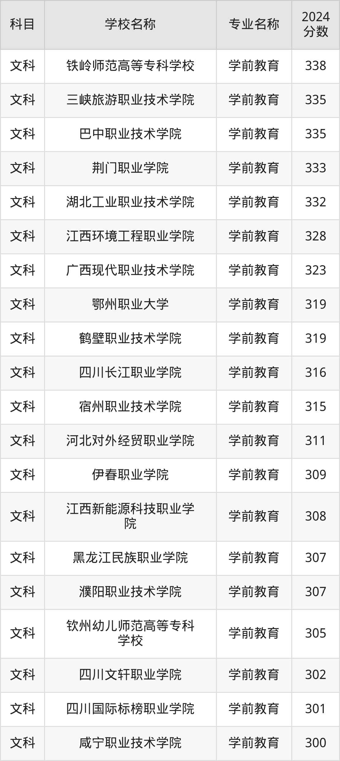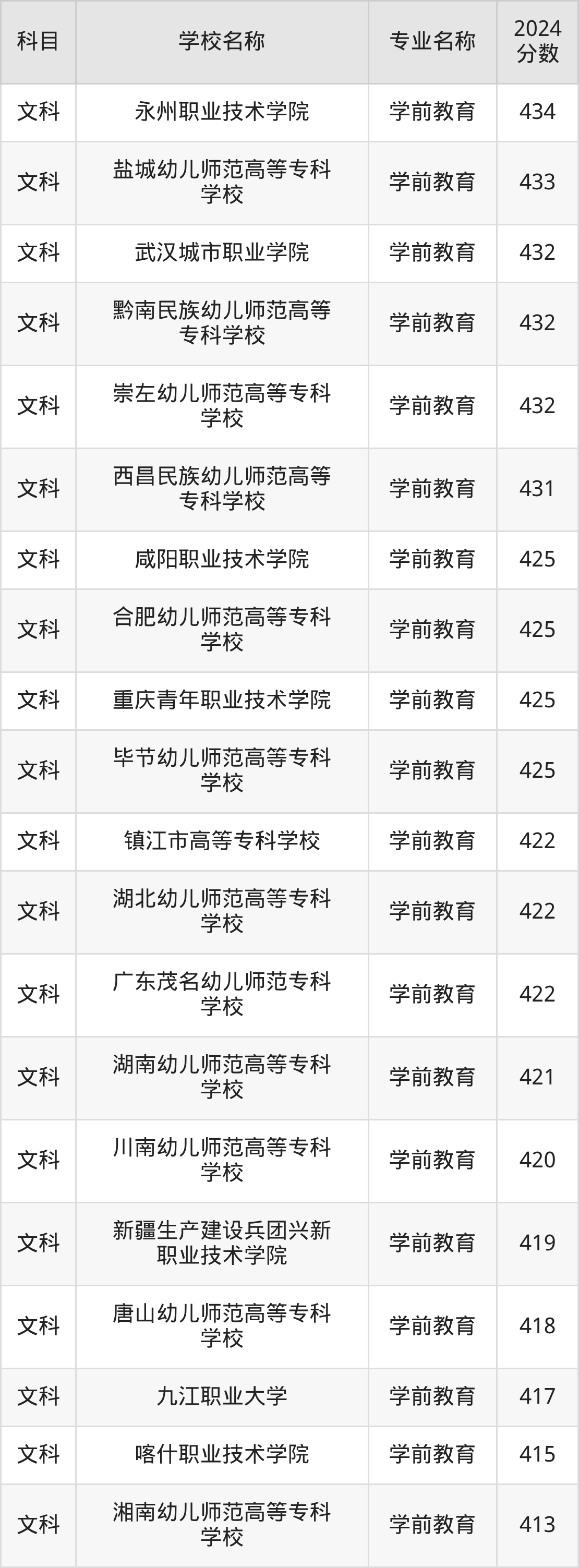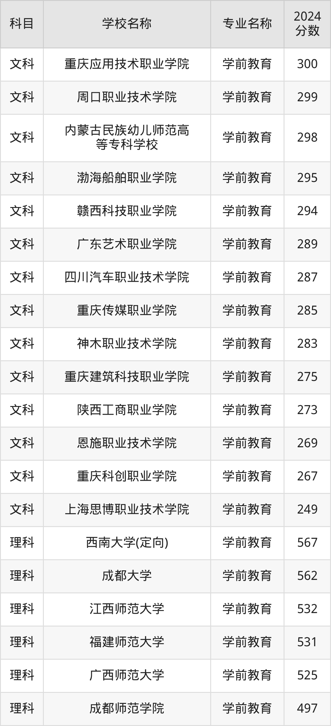 | 昆明幼儿师范高等专科 学校 | 学前教育(师范 类) | 301 |