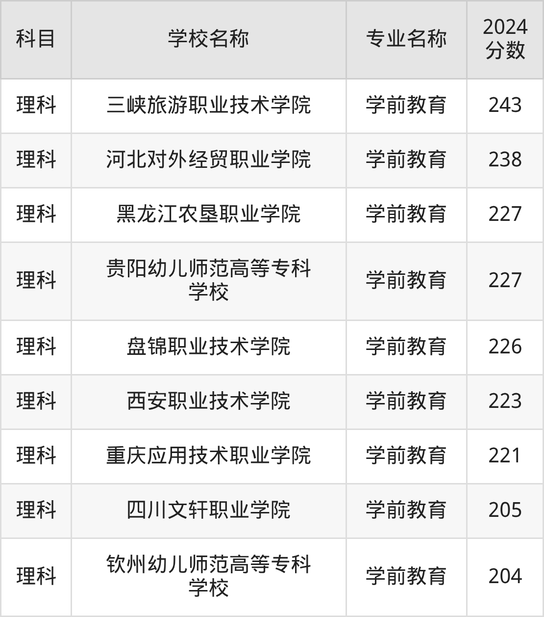 | 云南理工职业学院 | 学前教育 | 249 |