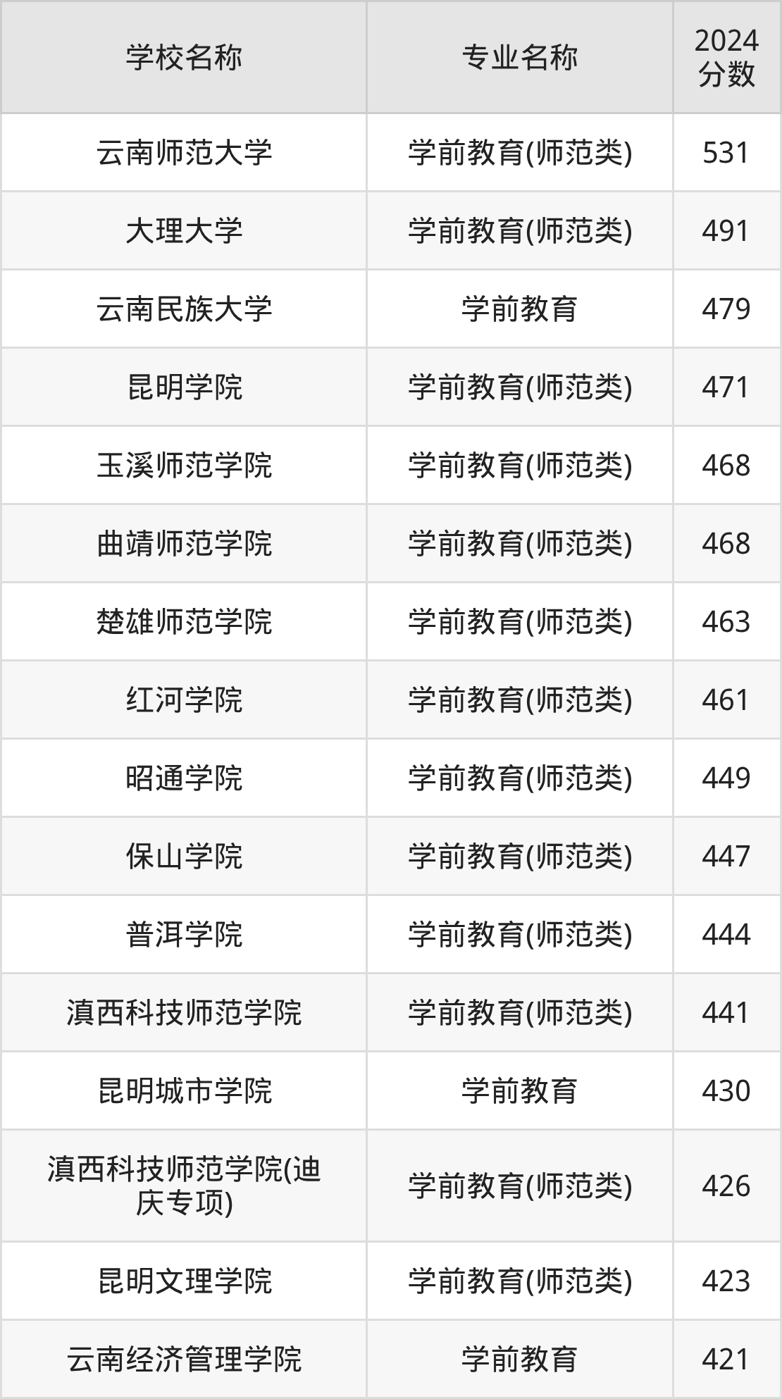 | 昆明学院 | 学前教育(师范 类) | 531 |