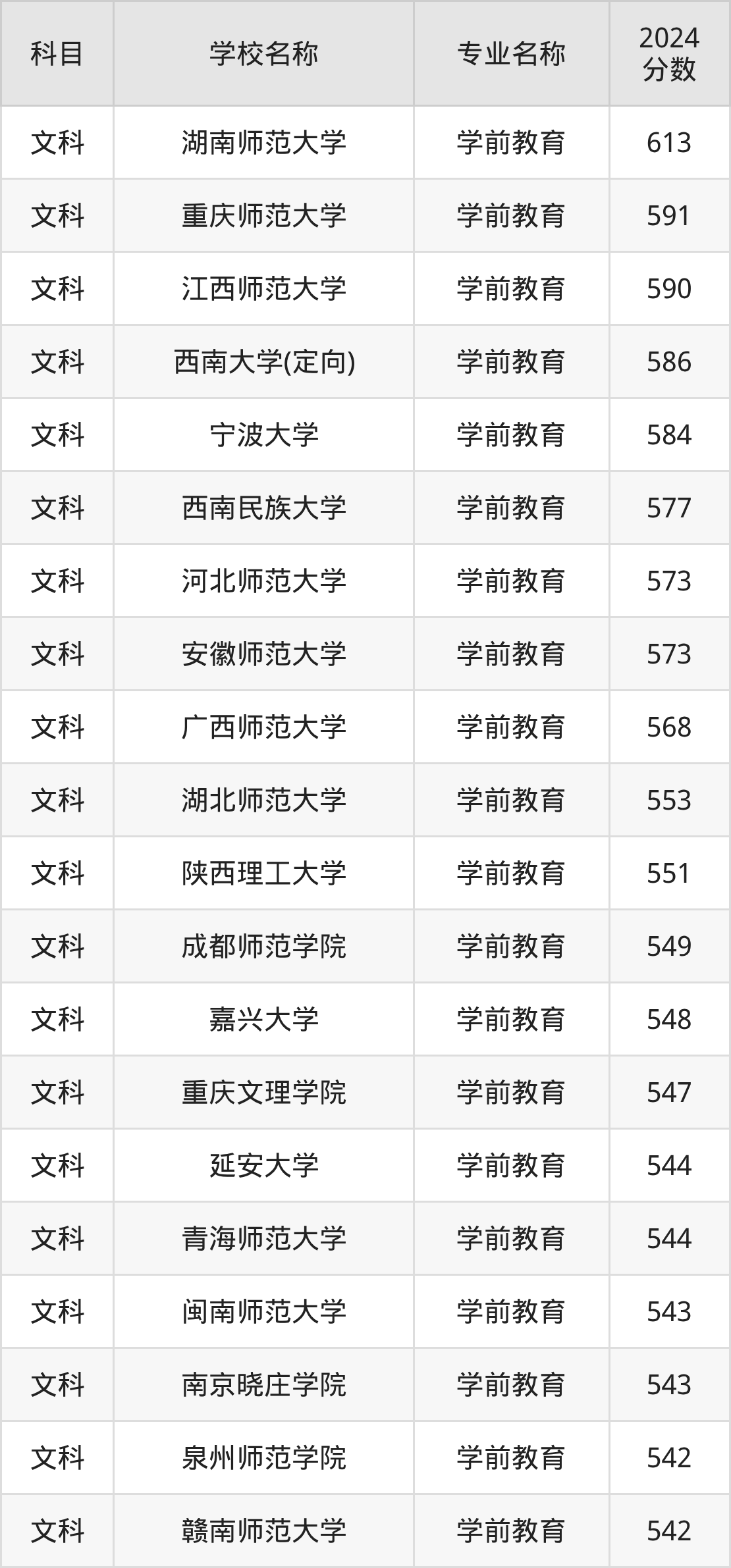 通过上文大家可以知晓,在云南省内招学前教育专业的院校数量较少,所以下文将为2026届高考生继续展示:省外大学的学前教育专业2024年在云南高考的录取情况,包含湖南师范大学、重庆师范大学、江西师范大学、西南大学(定向)、宁波大学。