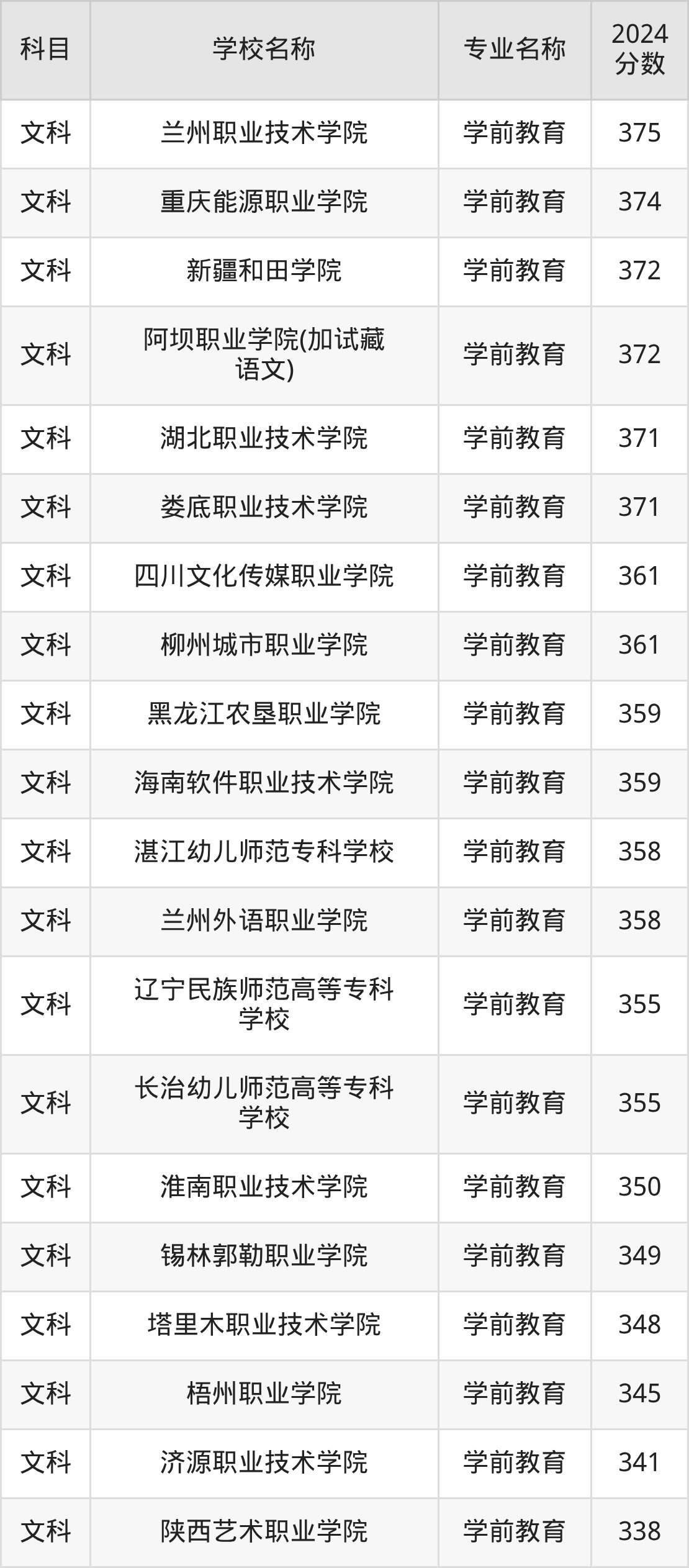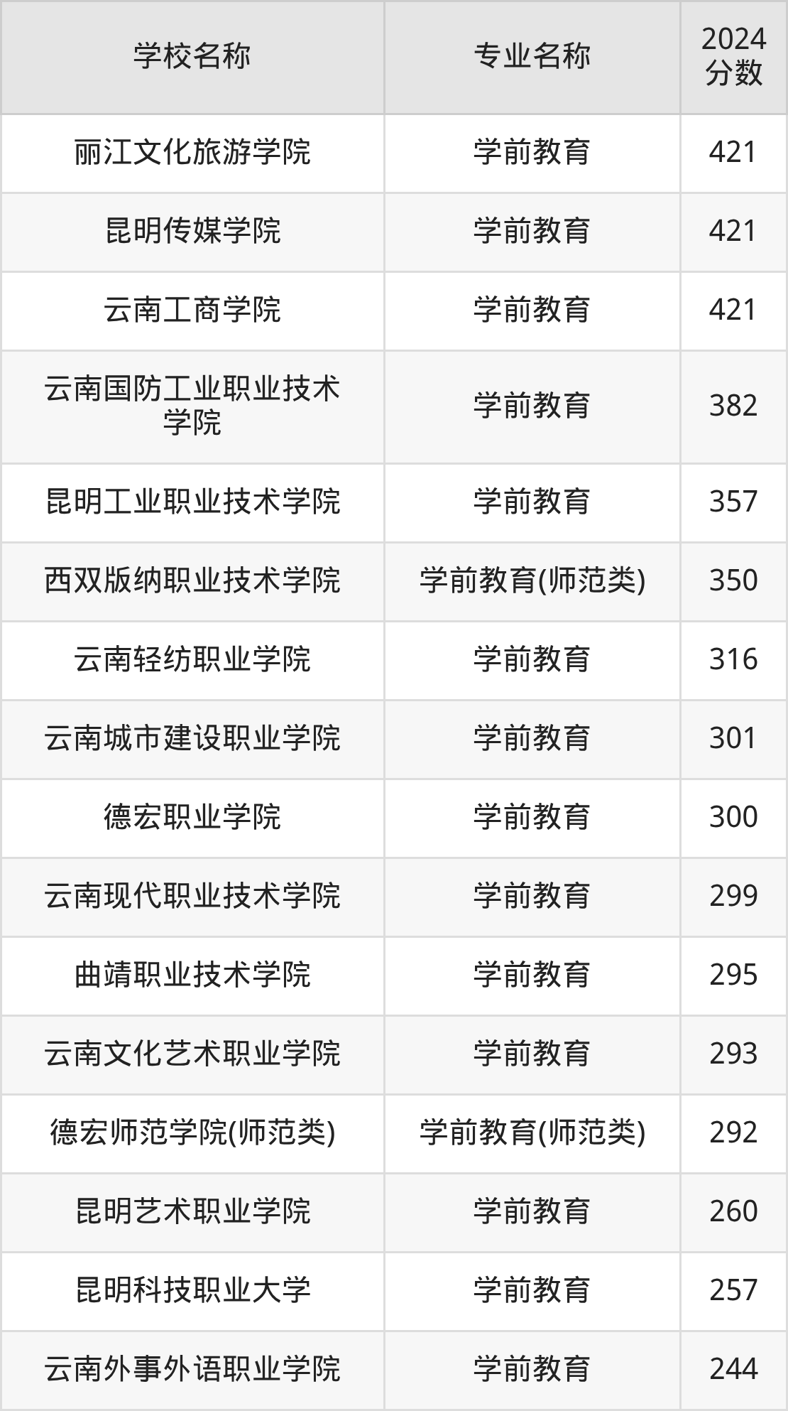 | 云南轻纺职业学院 | 学前教育 | 385 |