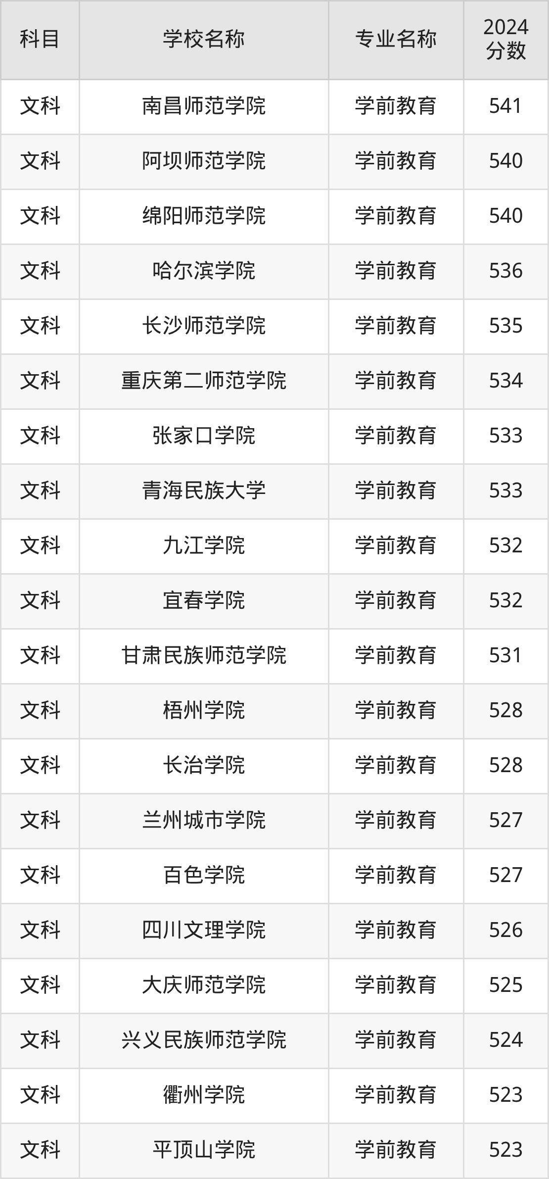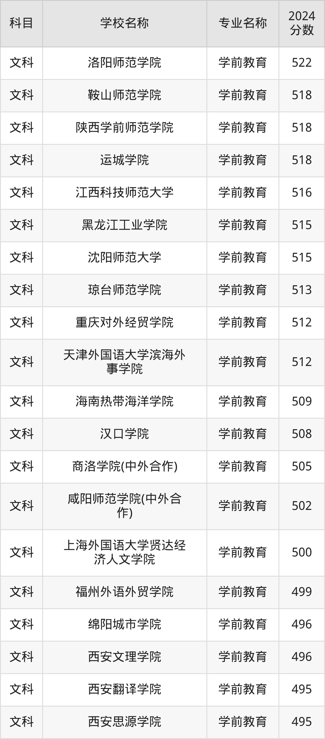 | 文山学院 | 学前教育(师范 类) | 516 |