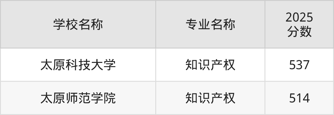 根据软科2025年专业榜单可知,开设知识产权专业且位于山西省内的大学排名如下。