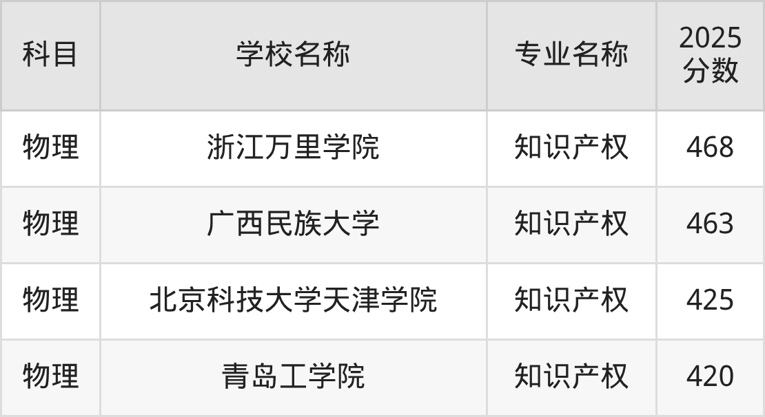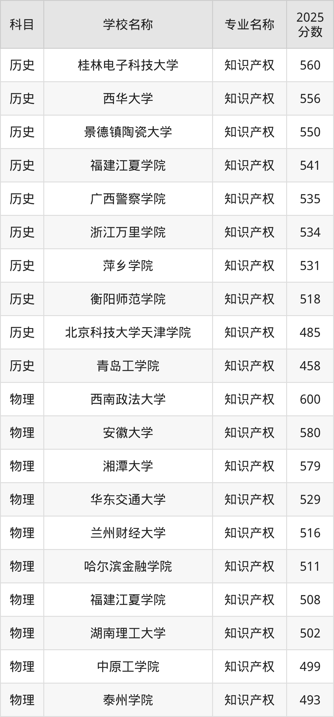 通过上文大家可以知晓,在山西省内招知识产权专业的院校数量较少,所以下文将为2026届高考生继续展示:省外大学的知识产权专业2025年在山西高考的录取情况,包含桂林电子科技大学、西华大学、景德镇陶瓷大学、福建江夏学院、广西警察学院。