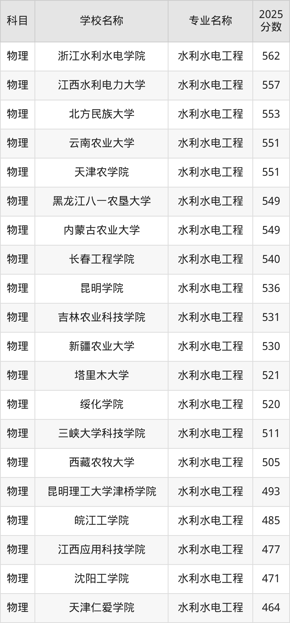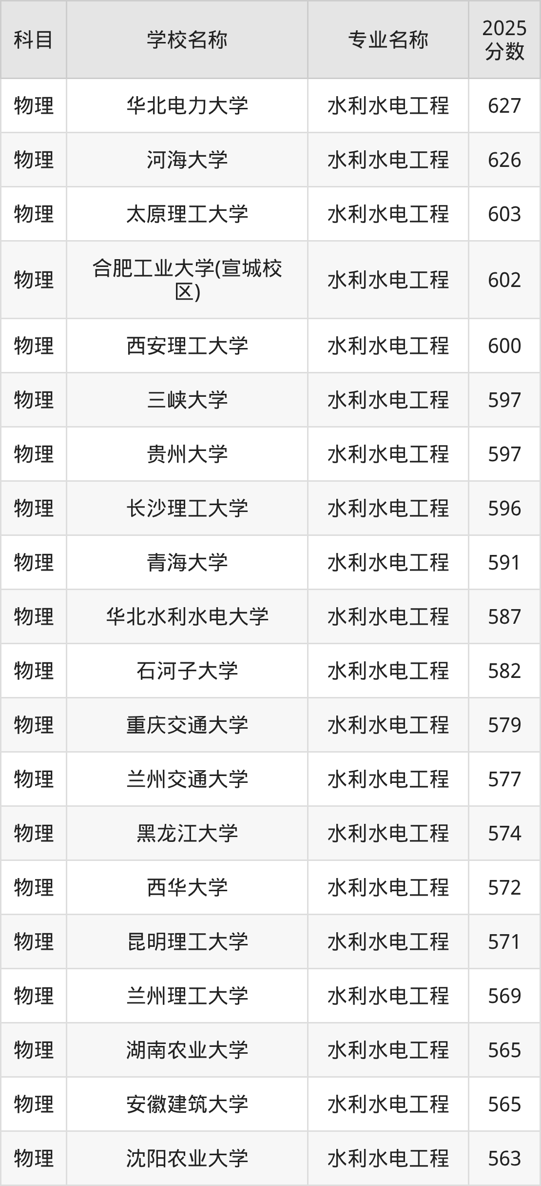 通过上文大家可以知晓,在河北省内招水利水电工程专业的院校数量较少,所以下文将为2026届高考生继续展示:省外大学的水利水电工程专业2025年在河北高考的录取情况,包含华北电力大学、河海大学、太原理工大学、合肥工业大学(宣城校区)、西安理工大学。