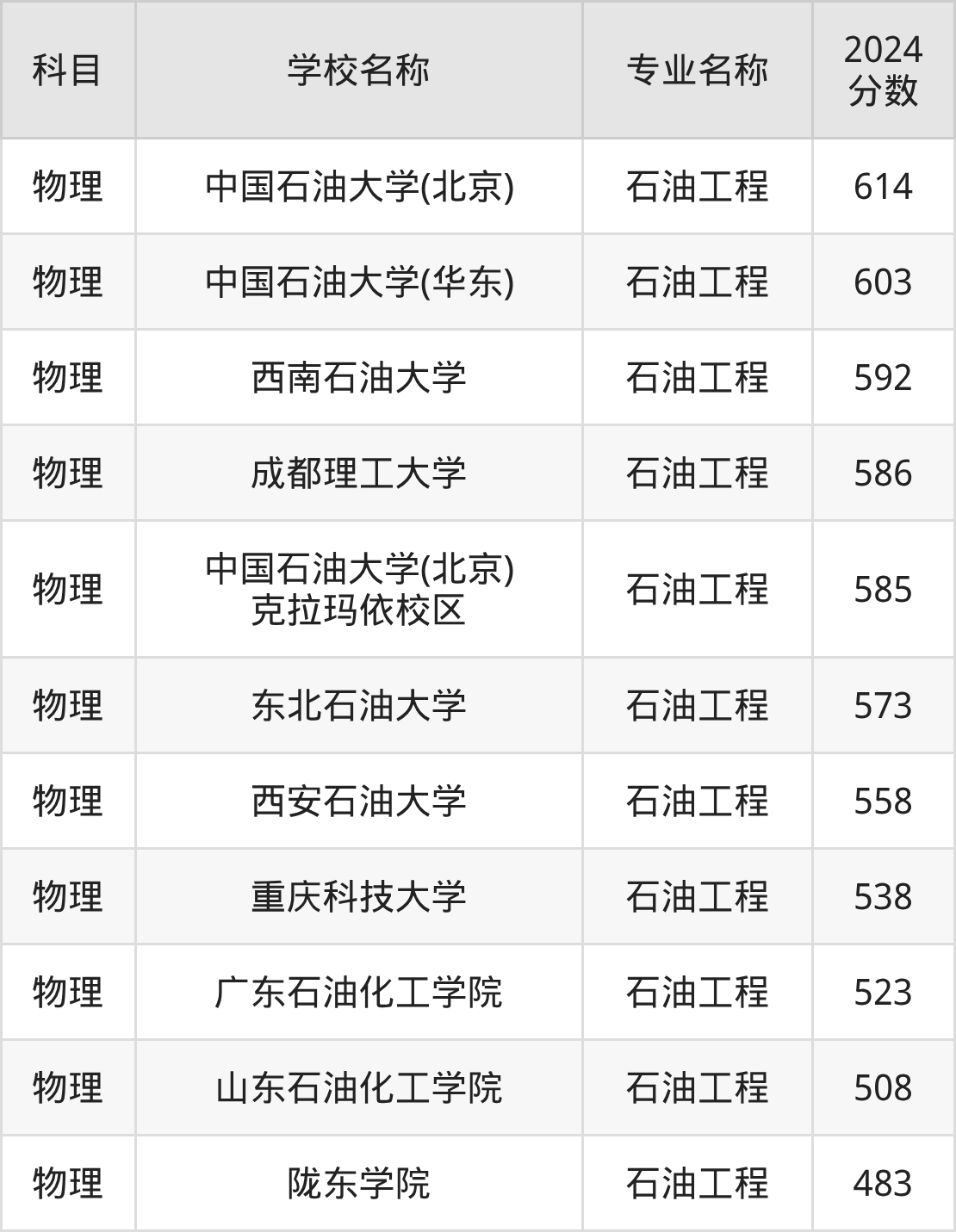 | 中国地质大学(武汉) | 石油工程 | 605 |