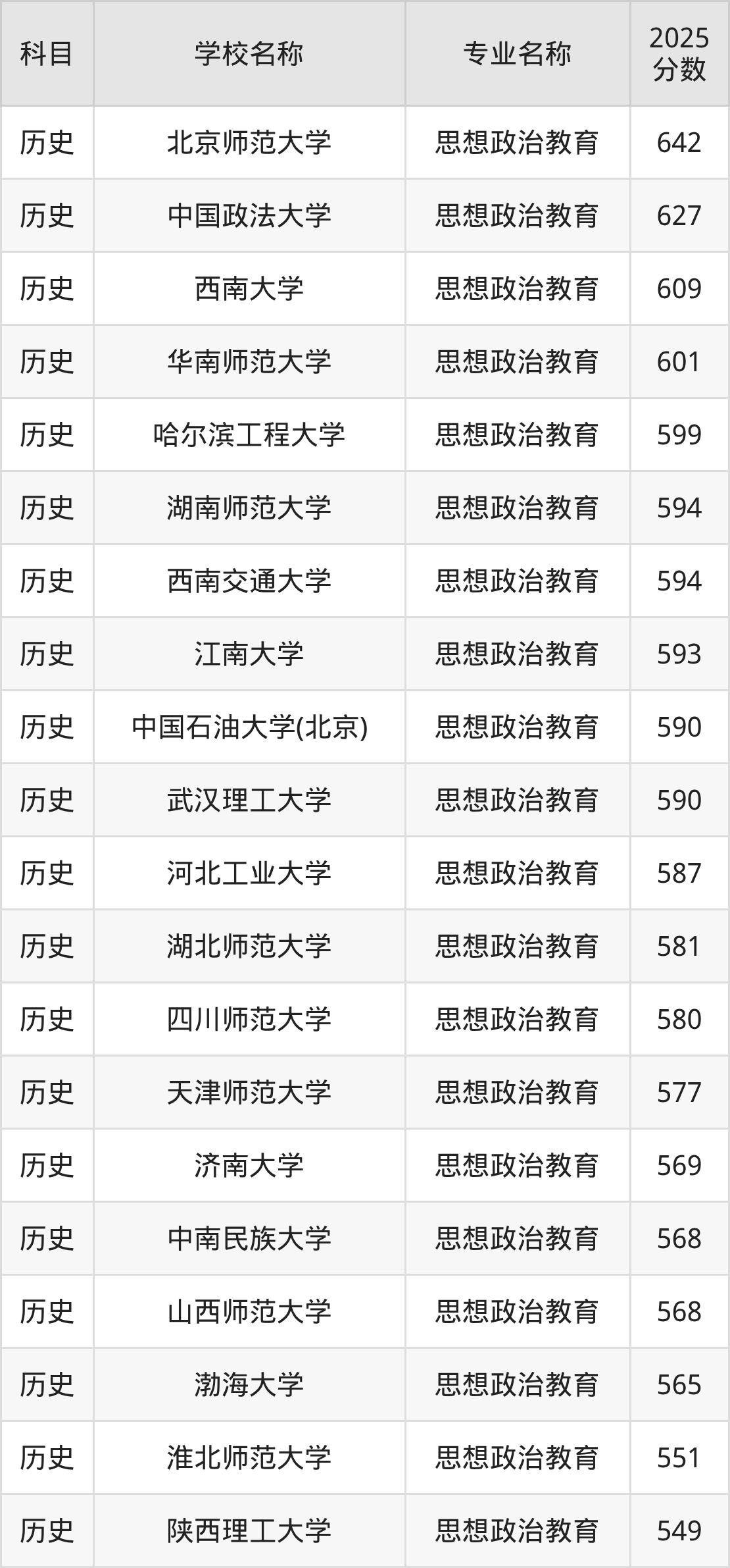 通过上文大家可以知晓,在吉林省内招思想政治教育专业的院校数量较少,所以下文将为2026届高考生继续展示:省外大学的思想政治教育专业2025年在吉林高考的录取情况,包含北京师范大学、中国政法大学、西南大学、华南师范大学、哈尔滨工程大学。