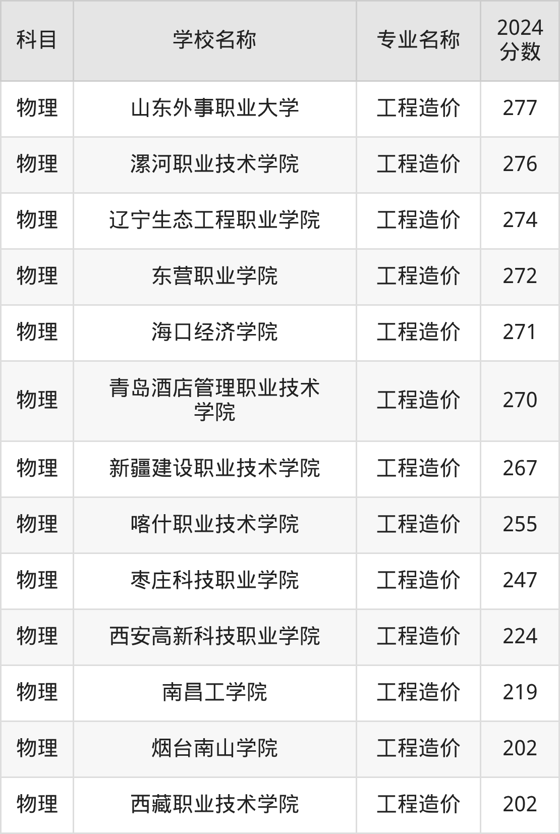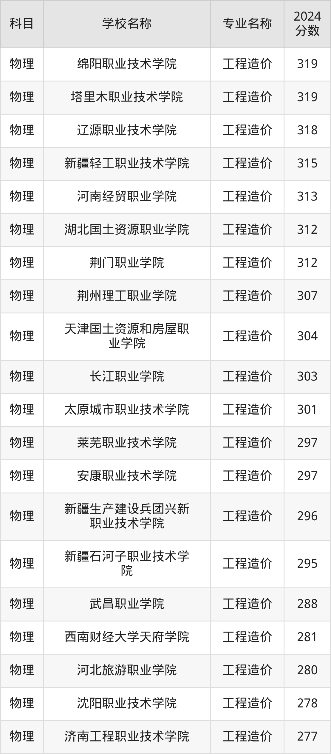 | 甘肃林业职业技术大学 | 工程造价 | 280 |