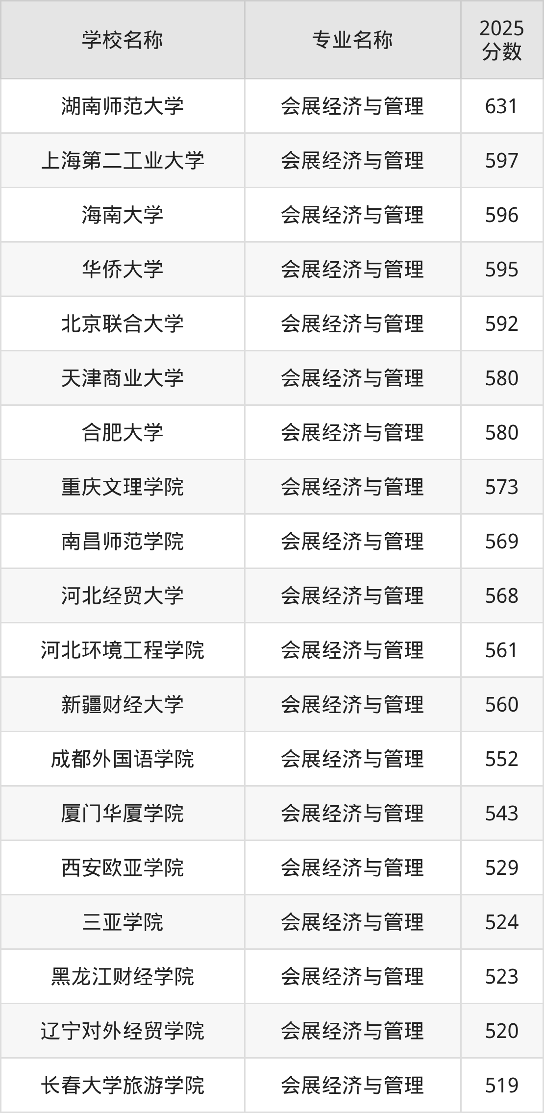 | 浙江传媒学院 | 会展经济与管理 | 582 |