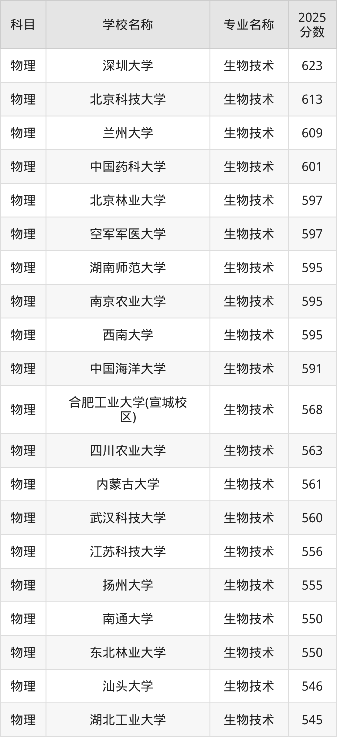 通过上文大家可以知晓,在山西省内招生物技术专业的院校数量较少,所以下文将为2026届高考生继续展示:省外大学的生物技术专业2025年在山西高考的录取情况,包含深圳大学、北京科技大学、兰州大学、中国药科大学、北京林业大学。