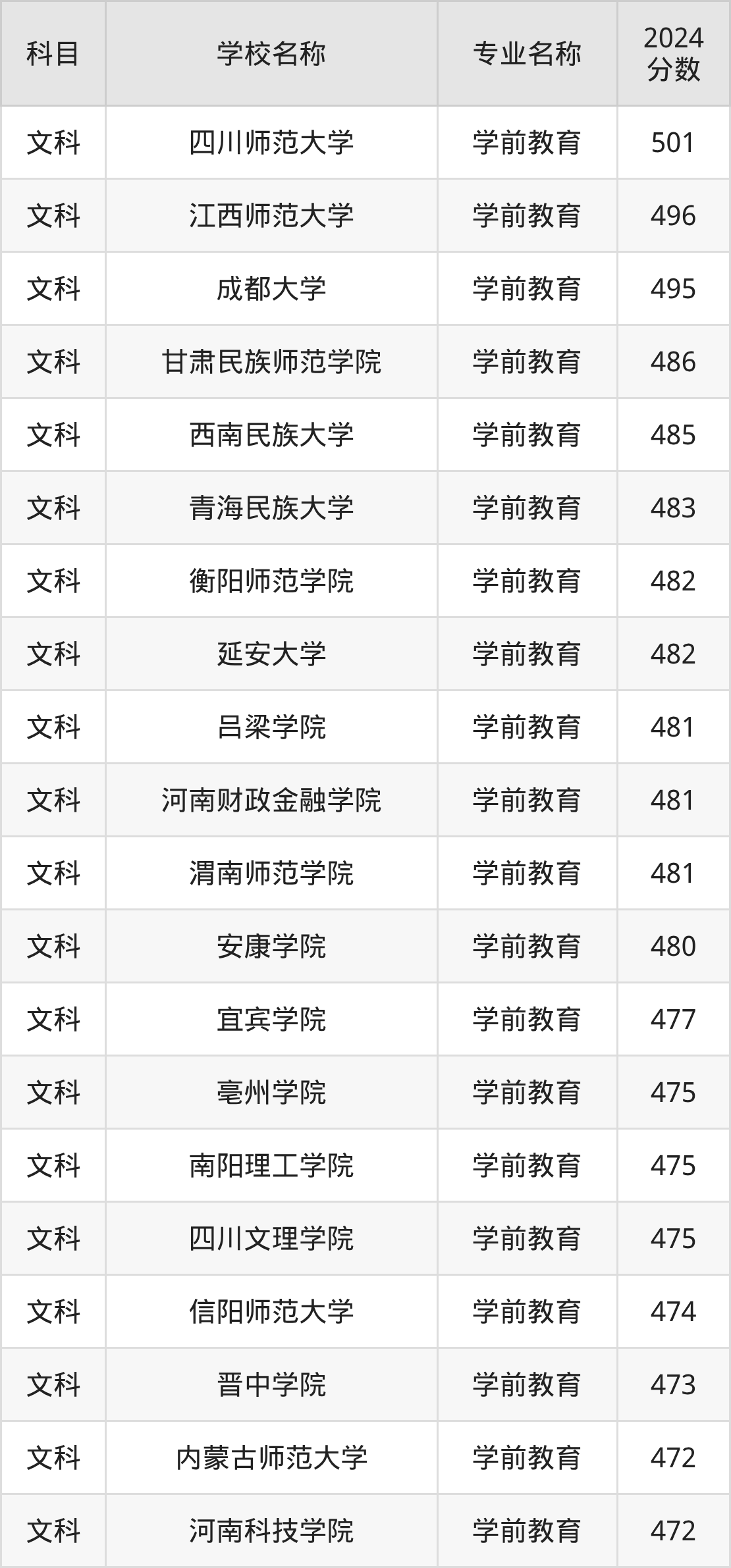 | 宁夏师范大学 | 学前教育(师范) | 483 |