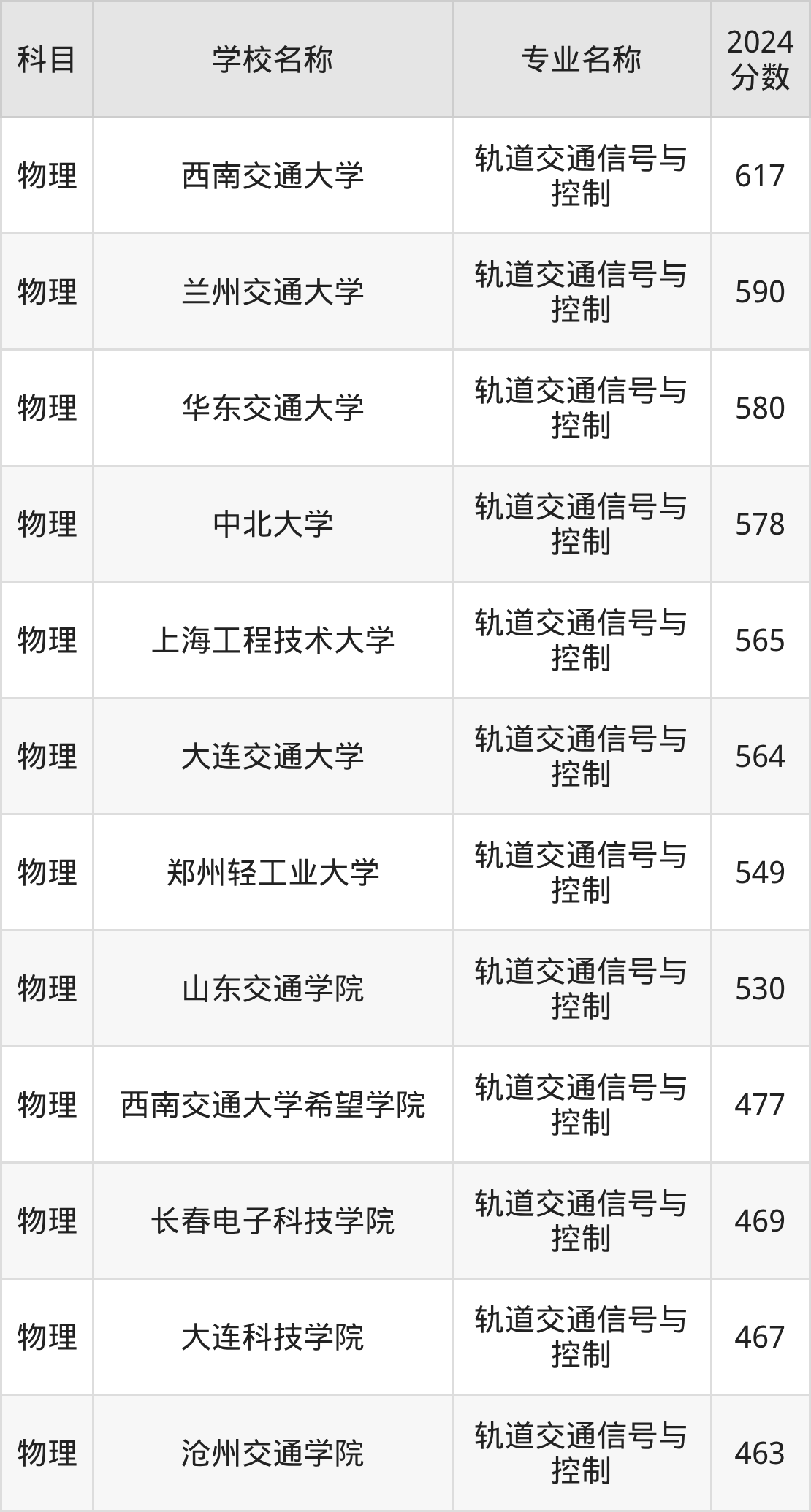 通过上文大家可以知晓,在江苏省内招轨道交通信号与控制专业的院校数量较少,所以下文将为2026届高考生继续展示:省外大学的轨道交通信号与控制专业2024年在江苏高考的录取情况,包含西南交通大学、兰州交通大学、华东交通大学、中北大学、上海工程技术大学。