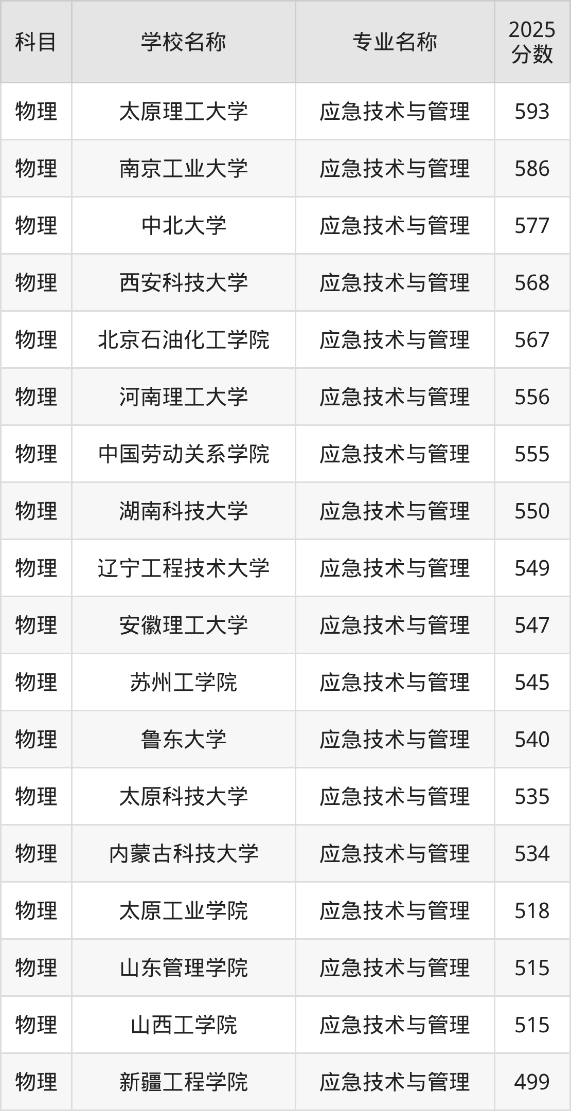 通过上文大家可以知晓,在河北省内招应急技术与管理专业的院校数量较少,所以下文将为2026届高考生继续展示:省外大学的应急技术与管理专业2025年在河北高考的录取情况,包含太原理工大学、南京工业大学、中北大学、西安科技大学、北京石油化工学院。
