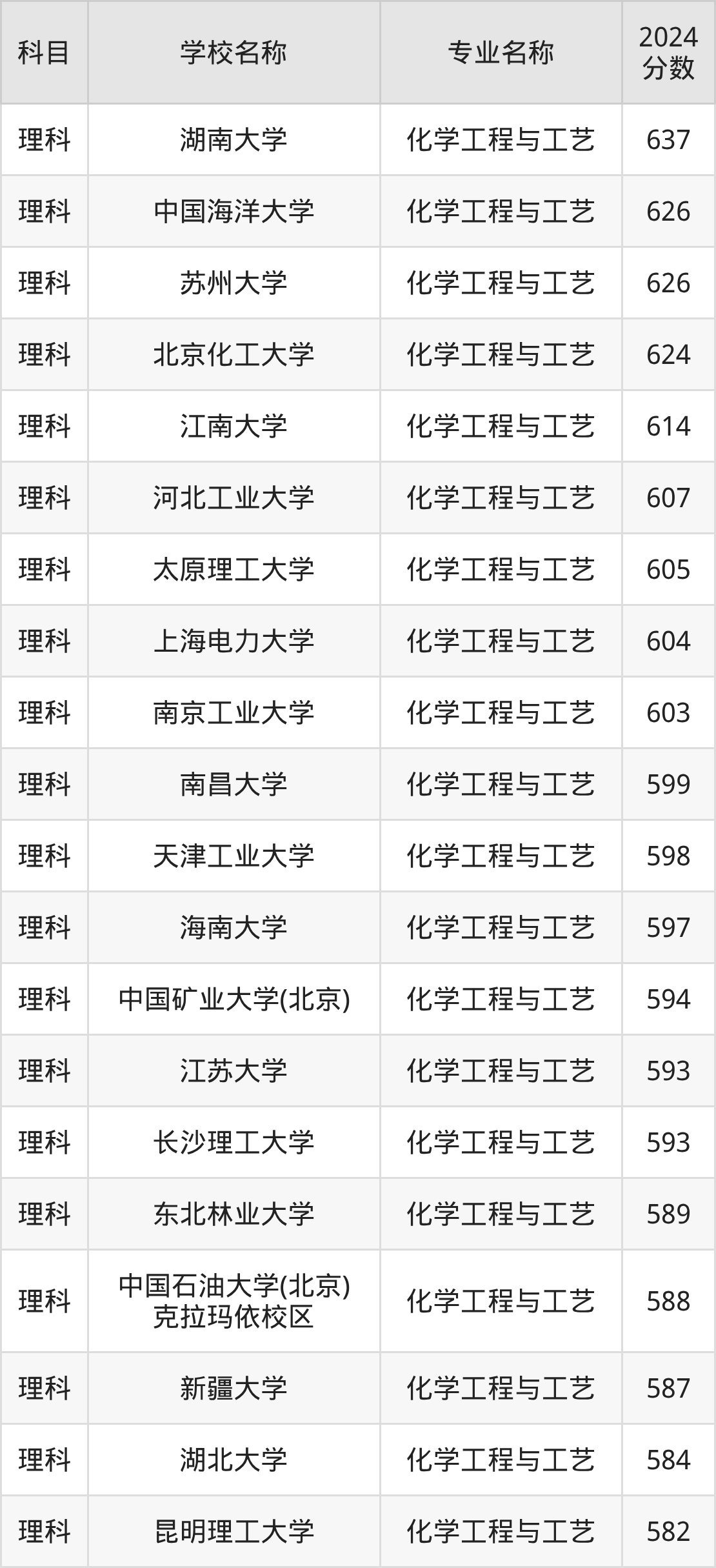 通过上文大家可以知晓,在四川省内招化学工程与工艺专业的院校数量较少,所以下文将为2026届高考生继续展示:省外大学的化学工程与工艺专业2024年在四川高考的录取情况,包含湖南大学、中国海洋大学、苏州大学、北京化工大学、江南大学。