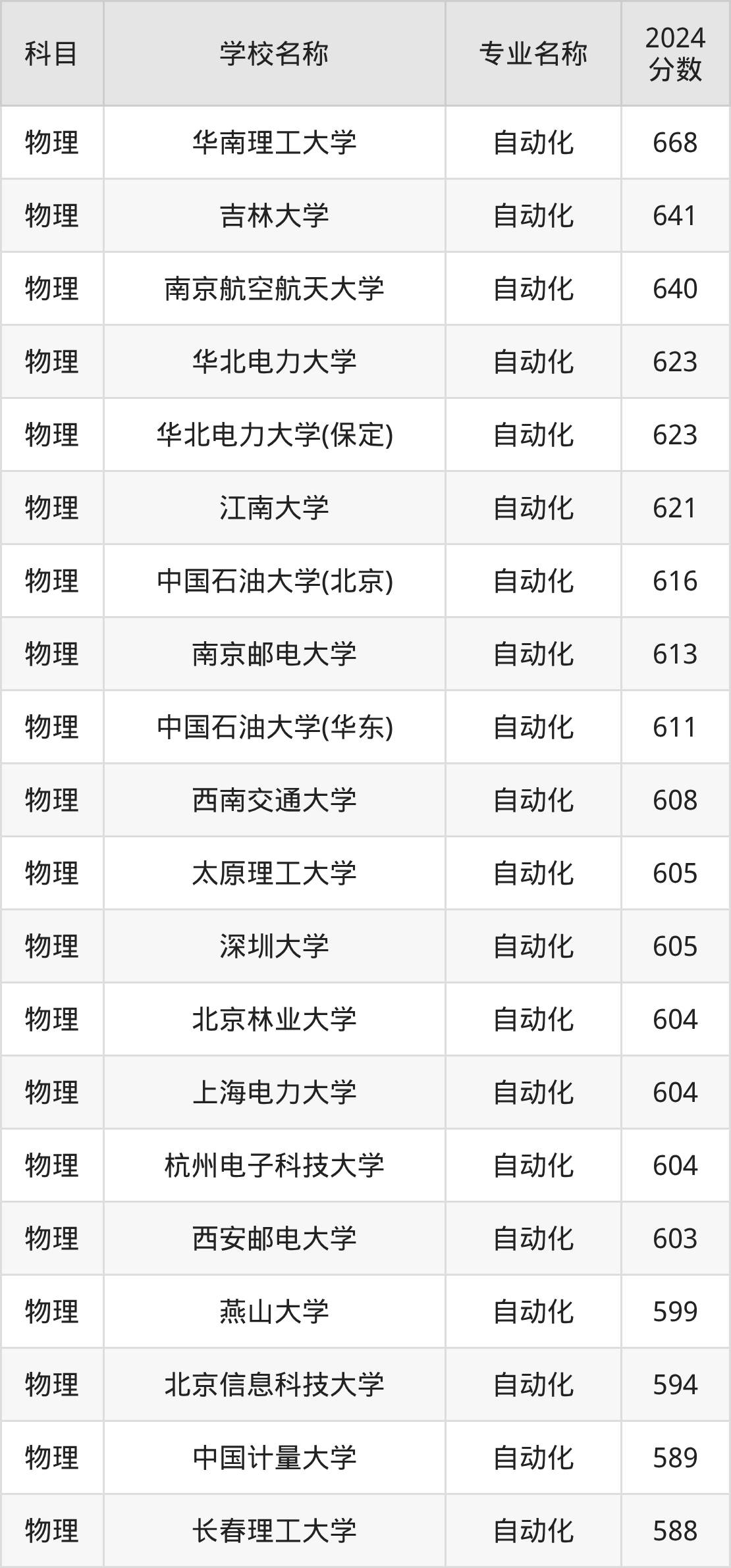 通过上文大家可以知晓,在黑龙江省内招自动化专业的院校数量较少,所以下文将为2026届高考生继续展示:省外大学的自动化专业2024年在黑龙江高考的录取情况,包含华南理工大学、吉林大学、南京航空航天大学、华北电力大学、华北电力大学(保定)。