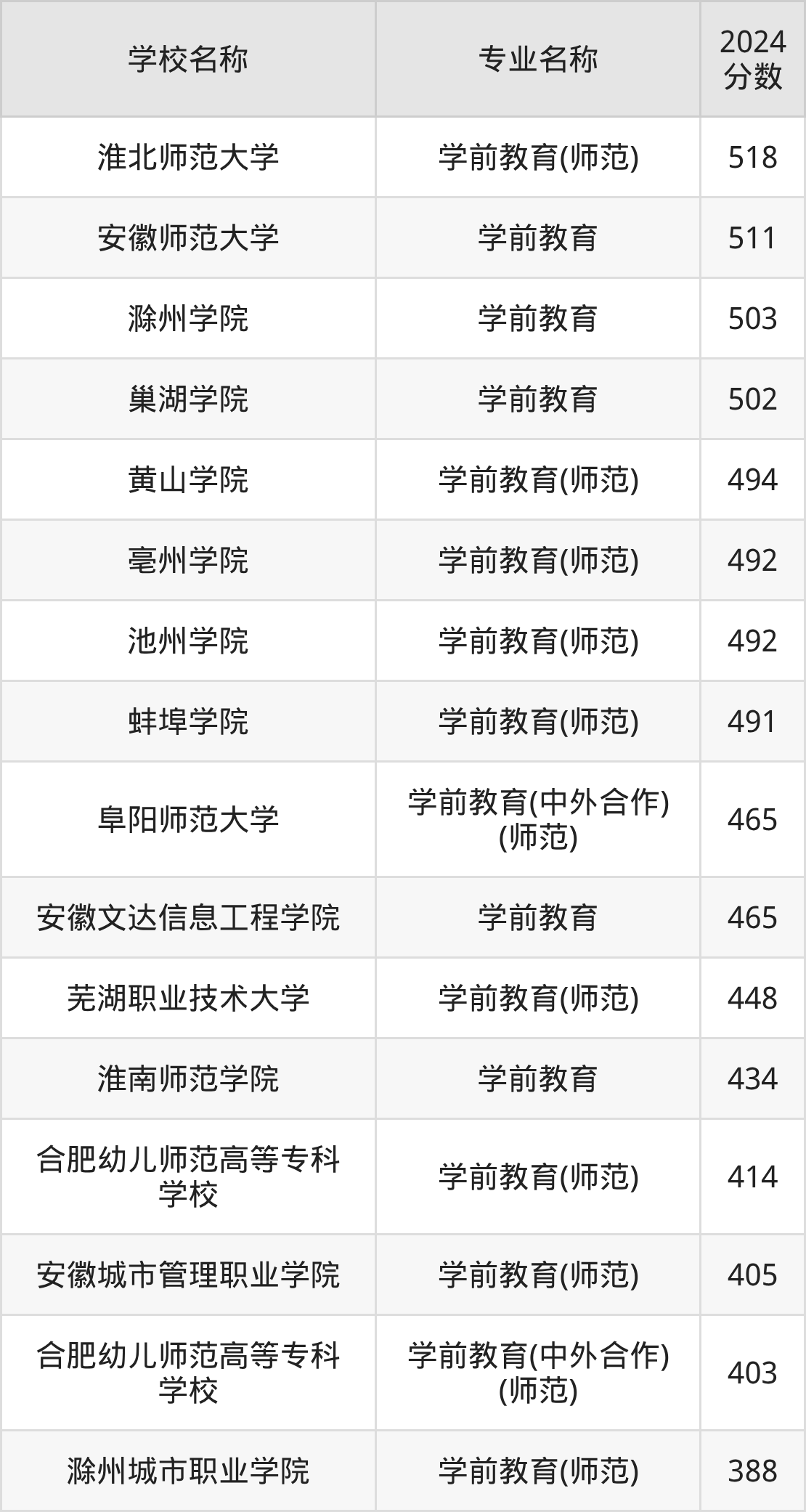 圆梦小编根据安徽2024年高考历史组专业分,将开设了学前教育专业且位于安徽省内的大学按照“录取分”从高到低排序,得出了以上榜单。