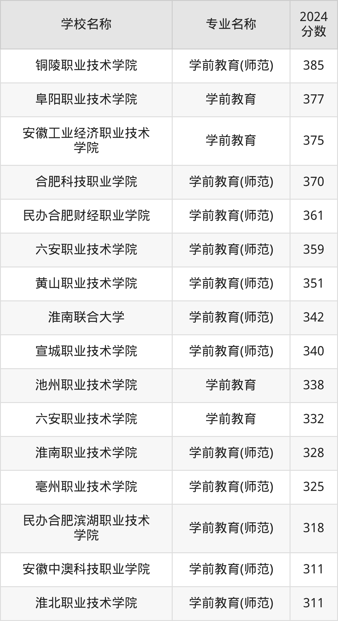 | 安徽工业经济职业技术 学院 | 学前教育 | 375 |