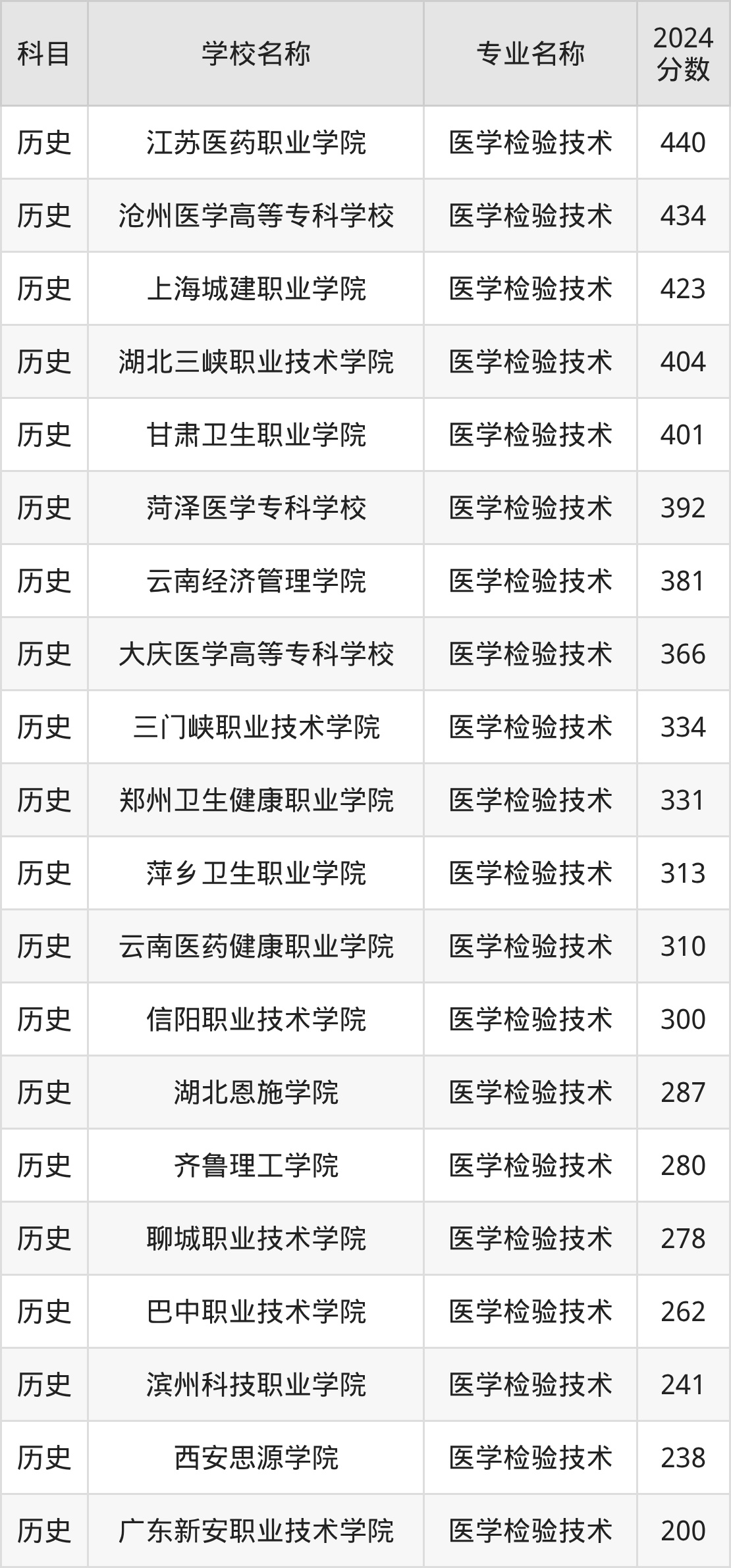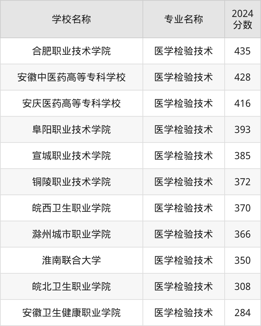 通过上文大家可以知晓,在安徽省内招医学检验技术专业的院校数量较少,所以下文将为2026届高考生继续展示:省外大学的医学检验技术专业2024年在安徽高考的录取情况,包含江苏医药职业学院、沧州医学高等专科学校、上海城建职业学院、湖北三峡职业技术学院、甘肃卫生职业学院。
