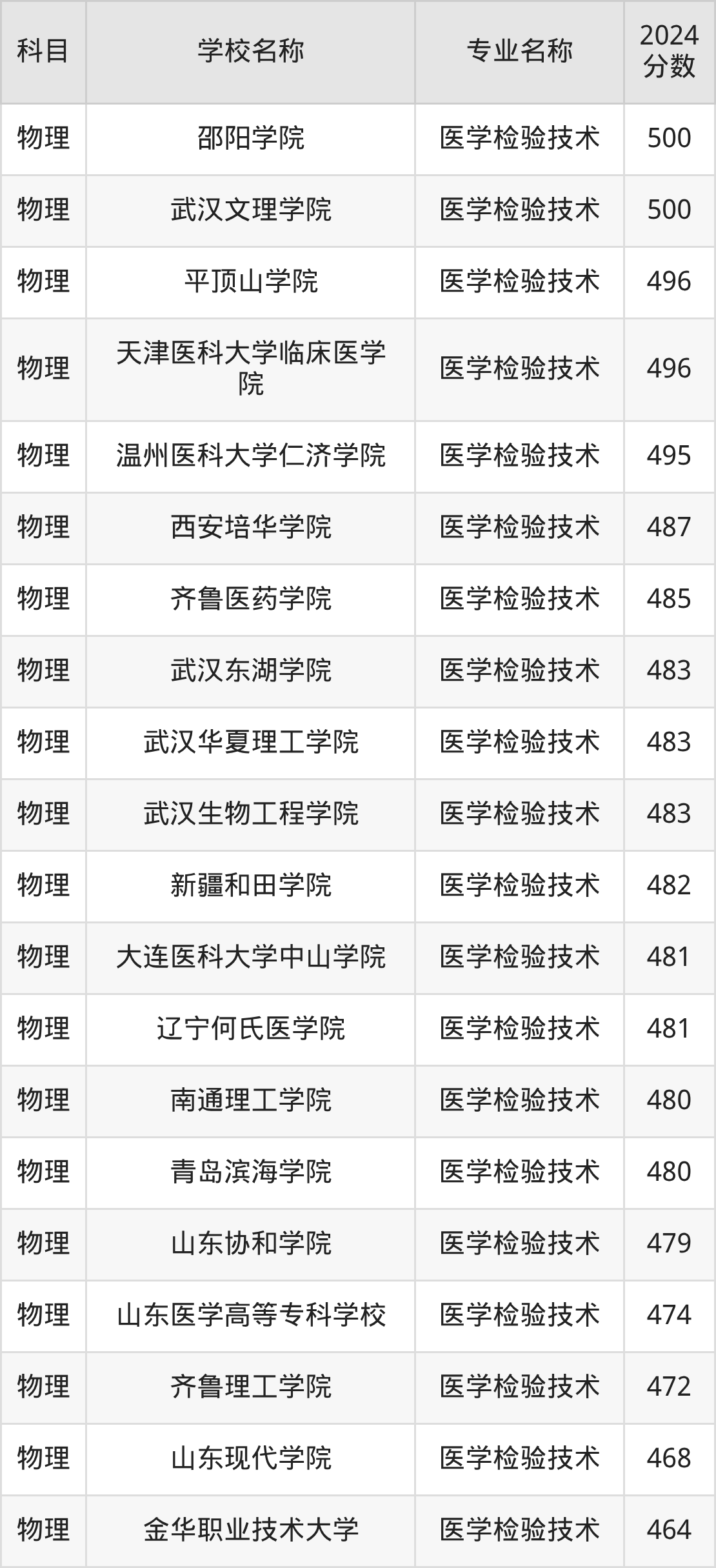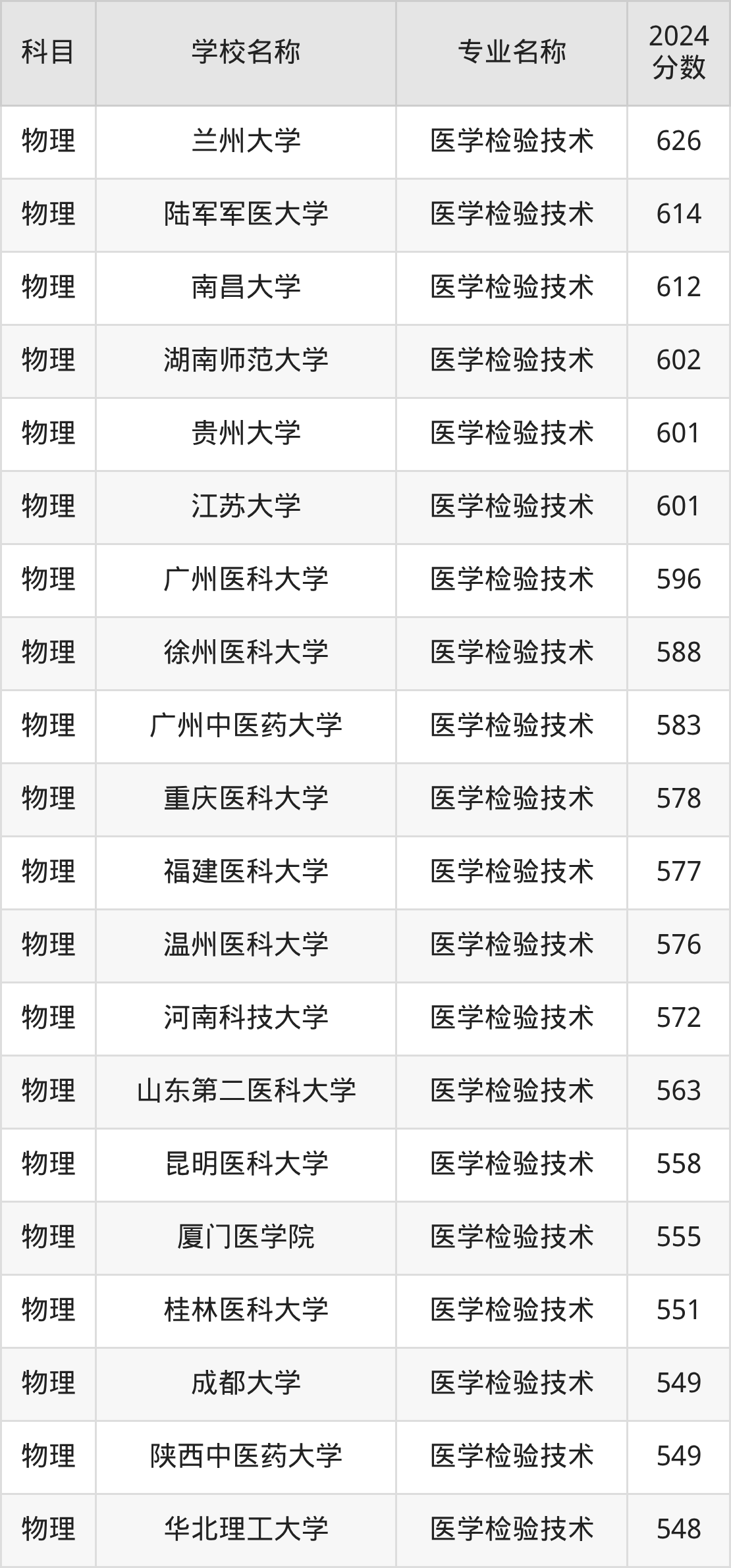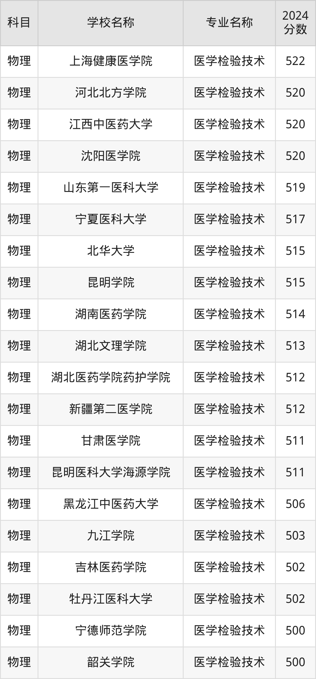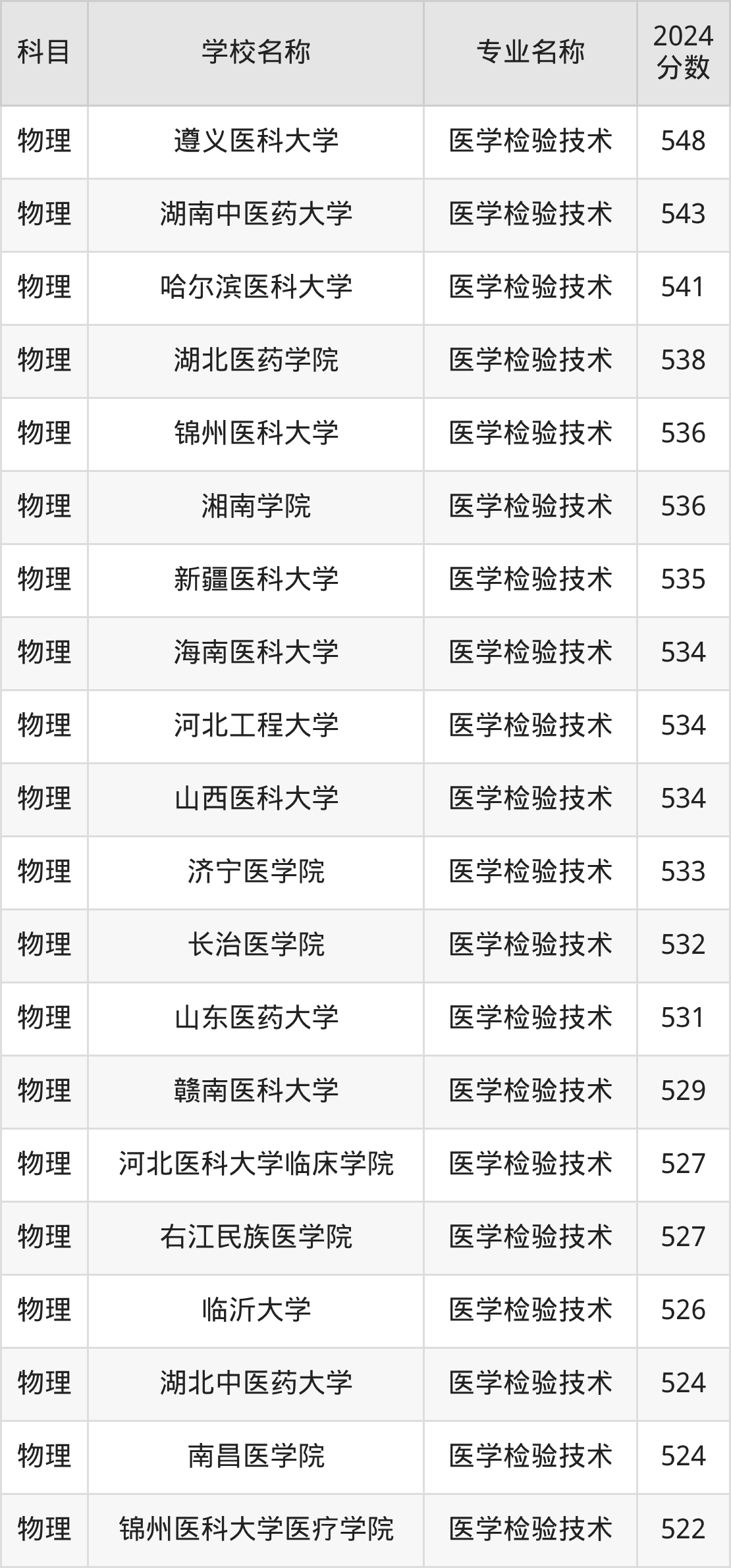在直接以“医学检验技术”的名称招生的安徽省大学中,安徽医科大学的分数线最高、排名第一名,在物理组的最低分是534分,全省排名前81219位的高考生才有较大机会被录取。