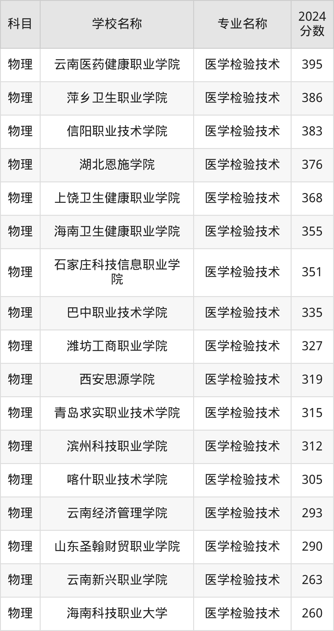 | 阜阳职业技术学院 | 医学检验技术 | 381 |