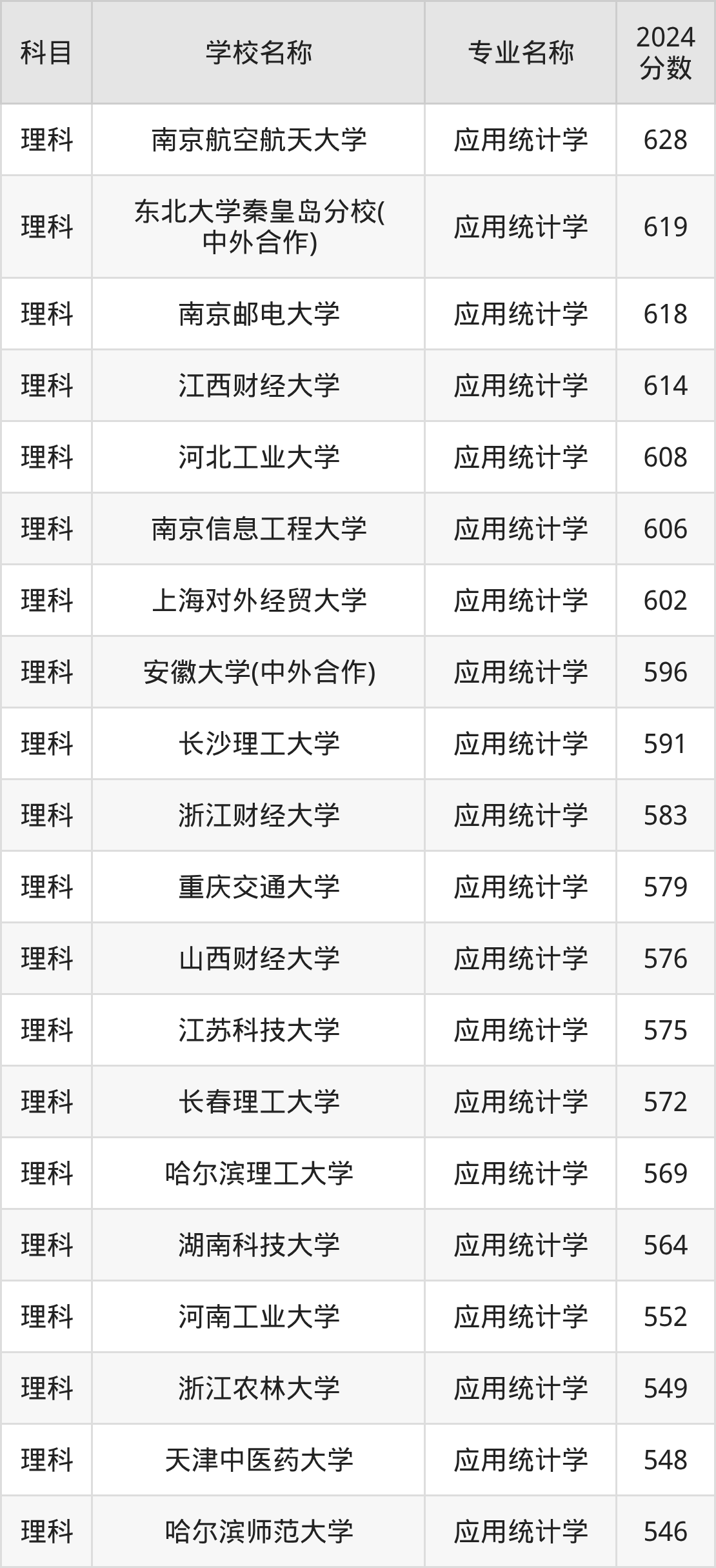 通过上文大家可以知晓,在四川省内招应用统计学专业的院校数量较少,所以下文将为2026届高考生继续展示:省外大学的应用统计学专业2024年在四川高考的录取情况,包含南京航空航天大学、东北大学秦皇岛分校(中外合作)、南京邮电大学、江西财经大学、河北工业大学。
