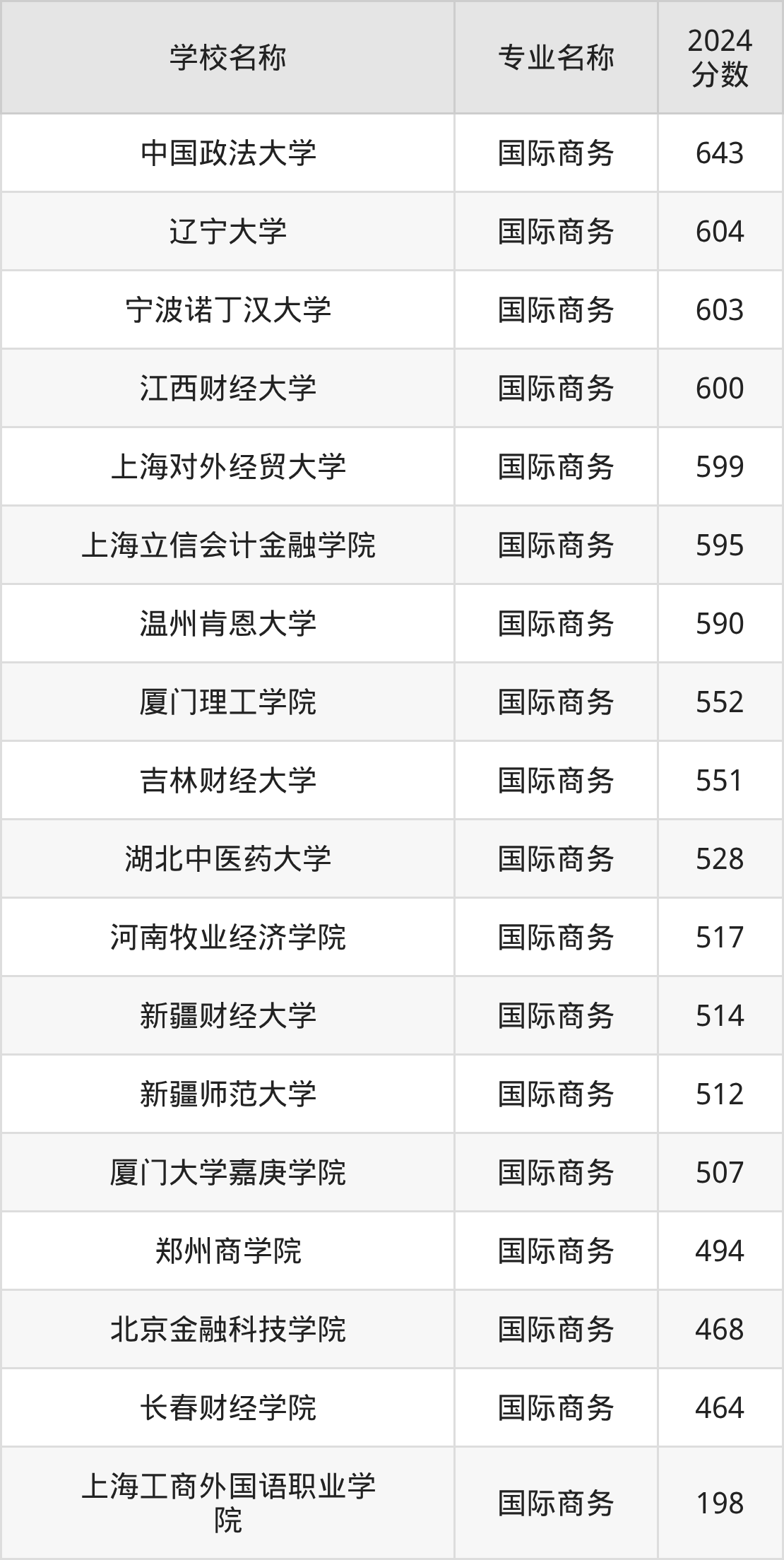 通过上文大家可以知晓,在天津市内招国际商务专业的院校数量较少,所以下文将为2026届高考生继续展示:市外大学的国际商务专业2024年在天津高考的录取情况,包含中国政法大学、辽宁大学、宁波诺丁汉大学、江西财经大学、上海对外经贸大学。