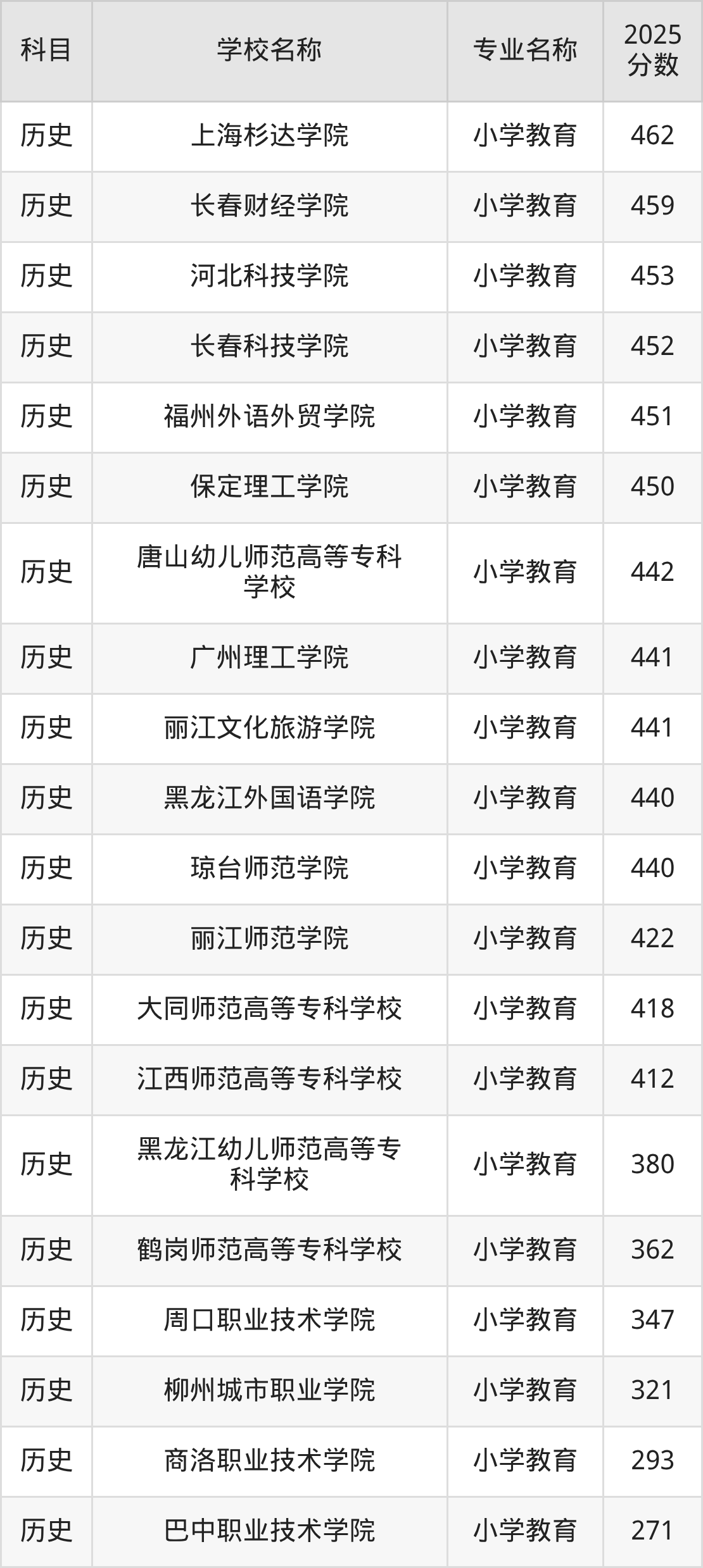 | 锦州师范高等专科学校 | 小学教育(师范 类) | 423 |